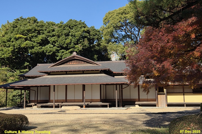 정원에 있는 찻집인 ‘수와노차야(諏訪の茶屋)’이다. 원래 에도성 다른 곳에 있었으나 1912년 이곳으로 옮겨졌다. 지붕의 곡선, 정교한 창산 문양 등 일본 전통 다실 건축의 특징을 잘 보여주고 있다.