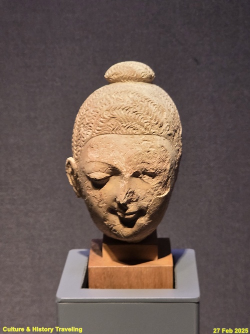 간다라 지역과 더불어 불상의 탄생지로 알려진 마투라 지역의 작품입니다. 돌출된 활 모양의 눈썹과 입가의 미소, 아담한 크기의 육계는 쿠샨 왕조 마투라 불상의 특징입니다. (안내문, 도쿄국립박물관, 2025년)