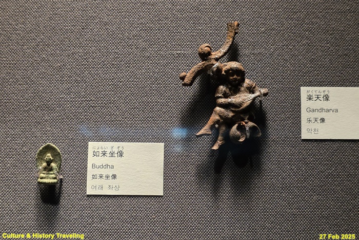 가운데 천인을 놓고 좌우로 가릉빈가를 배치했스니다. 가릉빈가란 사람의 얼굴을 가진 새를 뜻하며 이 작품은 가릉빈가의 아름다운 노랫소리에 맞춰 천인이 춤추는 모습을 표현한 것으로 여겨집니다. (안내문, 도쿄국립박물관, 2025년)