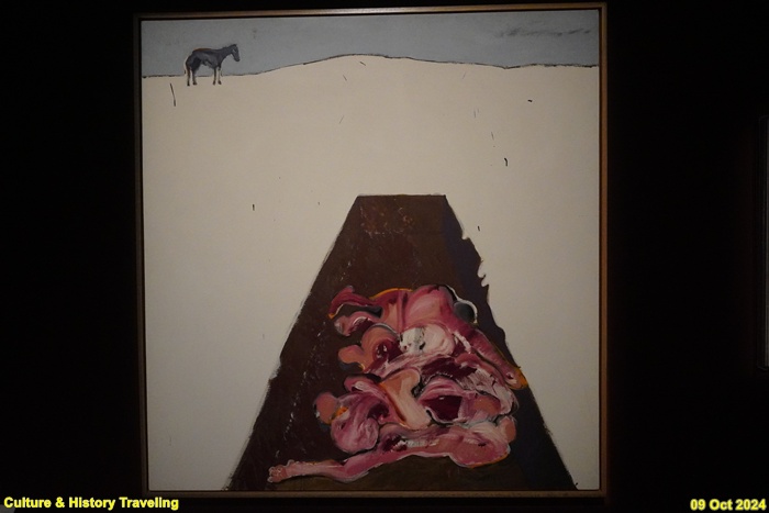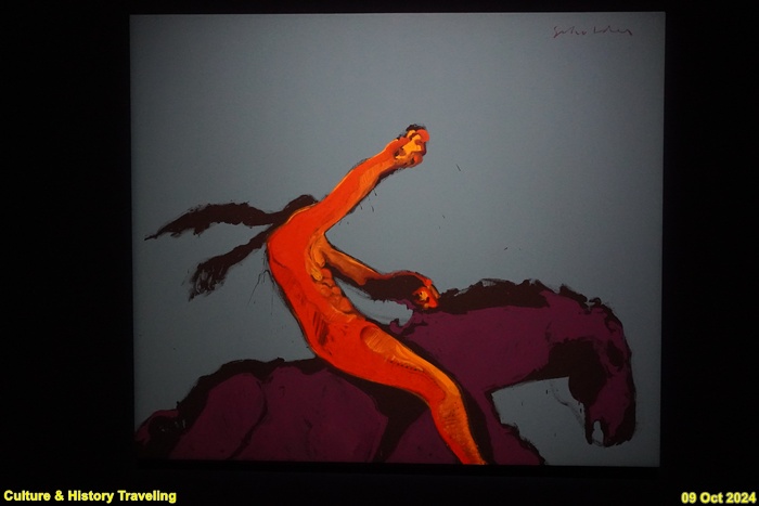 존 모이어스는 미국 카우보이 예술가회에서 활동하는 작가로 서부의 삶을 진정성 있게 표현해왔습니다. 그는 북미 원주민, 카우보이, 뉴멕시코주를 주제로 일상이나 주변 풍경을 그렸습니다. 이 그림에는 북미 원주민이 대평원에서 많은 말을 기르며 살아가는 모습이 담겨 있습니다. (안내문, 중앙박물관 특별전, 2024년)