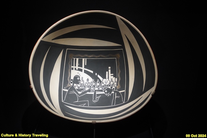 디에고 로메로는 코치티족 도예가입니다. 그는 점토와 천연 안료를 사용해 전통적인 코일링 기법으로 그릇을 만든 후 동시대 문제를 표현해 왔습니다. 이 작품에서 그는 원주민 공동체의 알코올 중독을 다뤘습니다. 그림 속 두 남자는 푸에블로족 남성의 전통적인 머리스타일을 했지만, 사회에서 힘겹게 살아가는 모습으로 그려집니다. 그가 묘사하는 인물은 현재를 사는 원주민의 어려움에 대한 은유입니다. 그들은 미국 스포츠를 시청하지만, 원주민 사회의 춤과 의식에 참여하기도 합니다. 많은 원주민들은 ‘두 세계에 사는 것’의 압박감에서 벗어나려고 하는데, 그 방법 중 하나가 술을 이용한 도피였습니다. (안내문, 중앙박물관 특별전, 2024년)