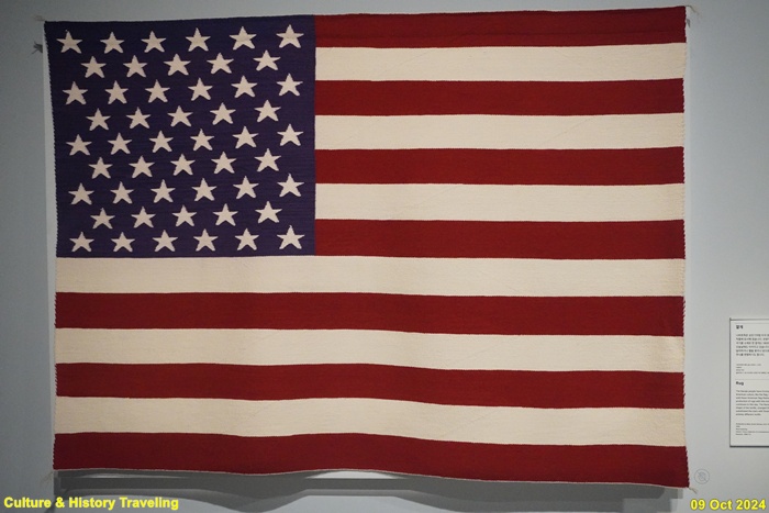 나바호족은 성조기처럼 미국 문화에서 인기 있는 상징을 작품에 묘사해 왔습니다. 관광객들에게 판매하기 위해 국기를 소재로 한 깔개는 1800년대 후반에 만들어져 오늘날에도 이어지고 있습니다. 때로는 별의 개수를 달리하거나 별을 꽃이나 닻으로 바꾸는 등 국기의 형태나 무늬를 변형하기도 합니다. (안내문, 중앙박물관 특별전, 2024년)