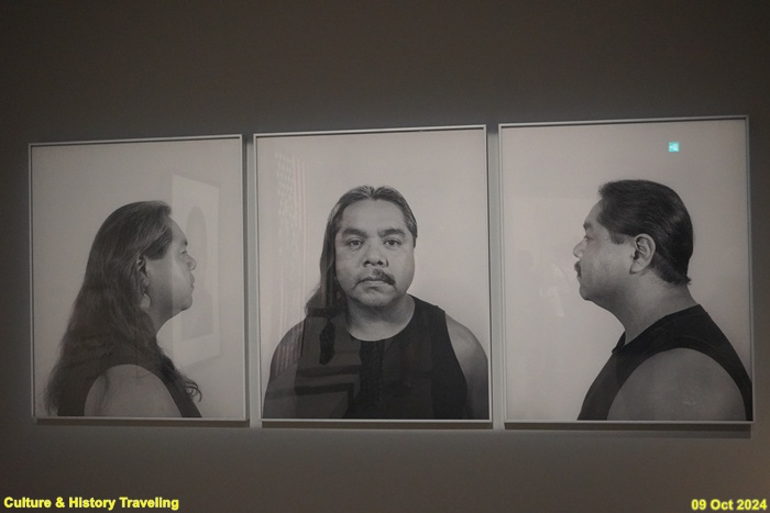 작가 제임스 루나는 재능이 많은 예술가입니다. 그는 공연, 사진, 그림 등 다양한 형태의 예술로 자기 생각을 표현합니다. 재밌는 말과 행동으로 사람들을 즐겁고 편안하게 만들기도 합니다. 그는 원주민이자 멕시코 사람으로서 차별을 겪은 경험을 작품으로 표현했습니다. 세 장의 사진은 콧수염과 장신구, 머리 길이에 따라 어떤 사람으로 보이는지, 사람들의 생각은 어떻게 변하는지를 물어봅니다. 작가는 누군가를 그가 가진 특징에 따라 평가하는 일이 좋지 않다고 여겼습니다. 이 작품에서 그는 미국 사람들이 북미 원주민과 멕시코 사람을 어떻게 생각하는지 살펴보기를 제안했습니다. (안내문, 중앙박물관 특별전, 2024년)