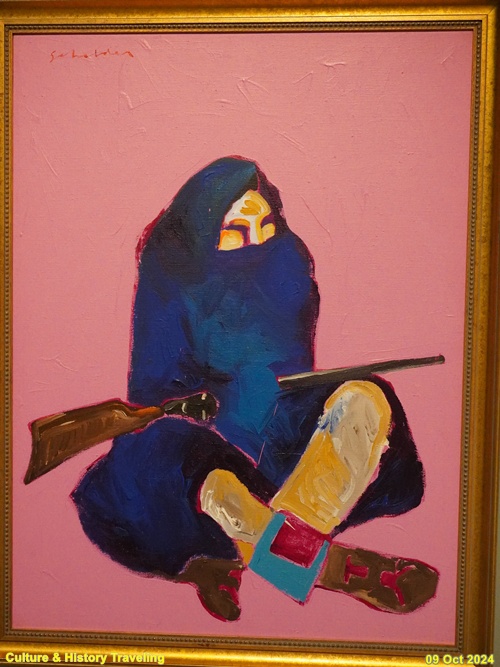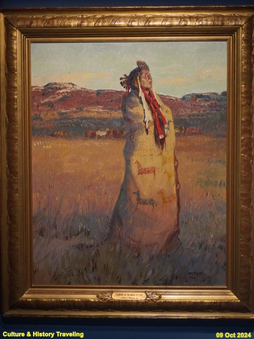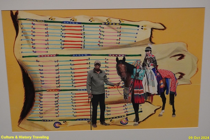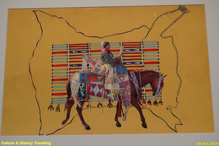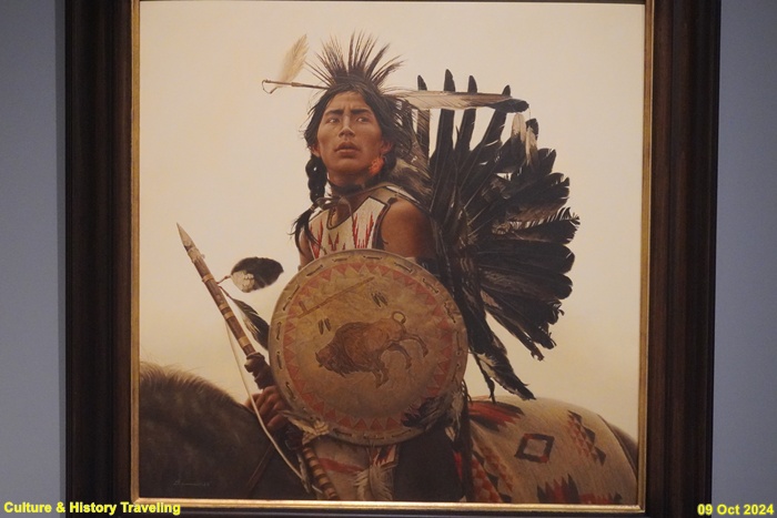 아직도 비원주민 예술가들은 원주민을 ‘사라져 가는’ 또는 ‘사라진’ 인종으로 표현하거나 이들을 ‘사라진 존재’로 연출하기도 합니다. 그들은 원주민을 있는 그대로가 아닌 자신들이 생각하는 모습으로 바라봅니다. 화면 속 젊은 남성은 호저 가시와 새 깃털 장식으로 몸을 치장하고 나바호 직물을 얹은 말 위에 앉아 있습니다. 이 그림은 1980년에 완성되었습니다. 당시 원주민은 더 이상 화면 속 원주민처럼 옷을 입지 않았고, 창과 방패를 들고 말을 탄 채 평원을 돌아다니지도 않았습니다. 원주민은 언제나 그랬듯이 모든 순간 동시대인입니다. (안내문, 중앙박물관 특별전, 2024년)