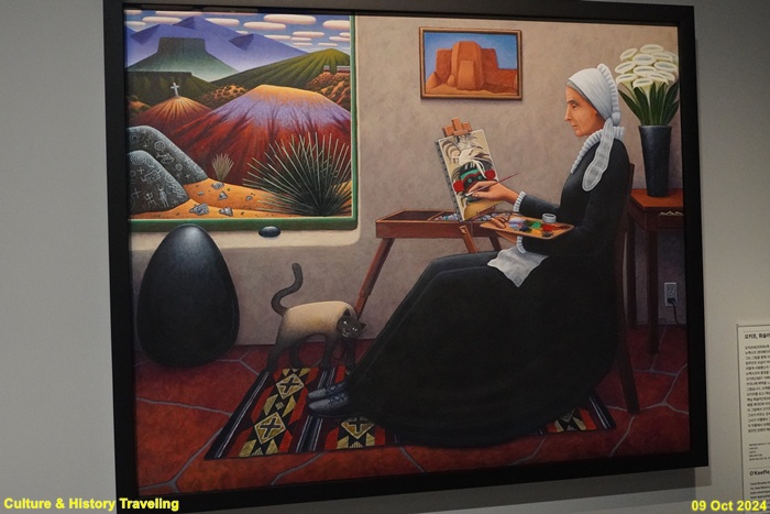 오지브와(치파와)족 예술가인 데이비드 브래들리는 뉴멕시코 샌타페이의 남서부 도시에 거주하며 활동했습니다. 그는 그림을 통해 사람들이 익숙하게 떠올리는 북미 원주민의 모습이 어떠한지, 원주민의 예술이 미국 문화에 어떻게 사용됐는지 이야기합니다. 이 작품에서 그는 뉴멕시코의 풍경을 담은 그림으로 유명한 예술가 조지아 오키프(1887-1986)를 그렸습니다. 오키프는 호피족 카치나에 매력을 느껴 이를 소재로 한 일련의 작품도 그렸습니다. 브래들리는 샌타페이에서 흑백 의상을 입은 오키프를 보고 <휘슬러의 어머니>로 더 잘 알려진 제임스 맥닐 휘슬러(1834-1903)의 유명한 그림, <회색과 검은색의 배열 제1호〉와 비슷한 구도로 그녀를 표현했습니다. 이 그림에서 오키프는 휘슬러 스타일의 구도로 그려졌지만 그녀가 머무는 곳의 창밖에는 샌타페이의 풍경이 보입니다 그녀가 이젤에서 그리고 있는 그림의 주제도 카치나입니다. 이 작품에서 브래들리는 오키프가 자신의 예술을 위해 원주민 문화의 예술성을 빌렸다고 이야기합니다. (안내문, 중앙박물관 특별전, 2024년)