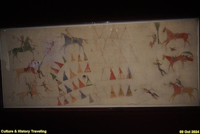대평원 지역에 사는 원주민들은 전쟁에서 승리했을 때의 장면을 티피와 개인 물건에 그림으로 기록했습니다. 주로 가죽에 그렸지만, 이 그림은 모슬린 천에 그렸습니다. 1800년대 후반, 미국 정부는 원주민에게 이주를 명령했습니다. 원주민들이 새롭게 살게 된 지역에서는 동물 가죽을 구하기 어려웠습니다. 그래서 가죽보다 구하기 쉬운 천을 사용해 중요한 사실을 기록했습니다. 이 그림은 압사로가족인 화이트 스완이 직접 겪은 이야기를 묘사한 것입니다. 그는 1876년 6월 미국 육군과 북미 원주민 사이에 벌어진 ‘리틀 빅혼 전투’라는 중요한 전투에 참여했습니다. 이 전투에서 원주민들은 미국 군대를 이겼습니다. 화이트 스완은 당시 미 육군 제7기병연대가 라코타족, 샤이엔족, 아라파호족 캠프로 자신들을 안내하도록 고용한 정찰병이었습니다. 그는 전투 상황을 여러 장면으로 나누어 그렸습니다. 그림 오른쪽 위, 화이트 스완이 주변을 살피는 모습을 볼 수 있습니다. 바로 아래에는 나팔수가 다친 화이트 스완을 구하고, 그 아래는 화이트 스완이 적을 공격하는 모습입니다. 왼쪽 위는 그가 적에게 둘러싸여 적을 공격하고 있습니다. 왼쪽 아래에는 그가 말을 탄 적을 죽이는 모습입니다. (안내문, 중앙박물관 특별전, 2024년)