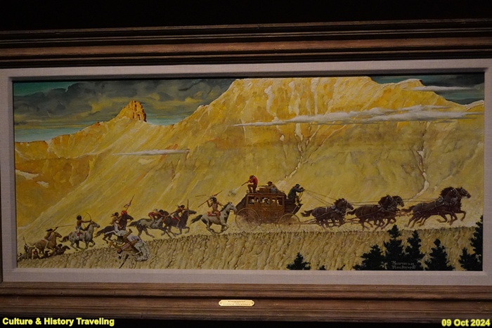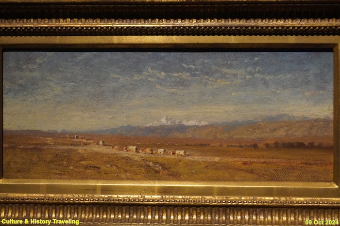 19세기 서비 지역 전경을 담은 그림은 미국이 영토를 확장하는 과정을 담은 중요한 기록으로 평가 받습니다 . 이 그림은 서부 개척에 나선 이주민들이 지붕이 있는 마차를 타고 대평원을 가로지르는 이상적이고 낭만적인 모습을 보여줍니다. 대평원을 약속의 땅으로 표현한 이런 그림은 이주민들의 서부 확장과 정복을 자연스러운 일로 여기게끔 하여 서부 개척을 장려했습니다. (안내문, 중앙박물관 특별전, 2024년)