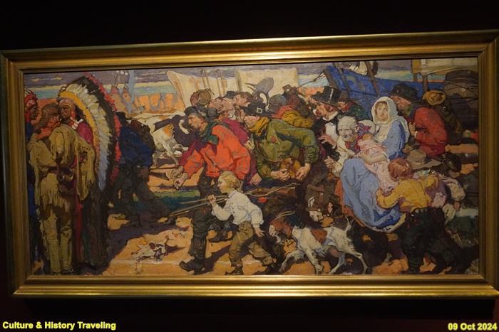 16세기 이후 영국, 프랑스, 스페인 등에서 온 이주민들은 북미 대륙 여러 곳에 정착촌을 만들었습니다. 그 중에서 오늘날 미국을 만든 초기 이주민들은 동쪽 바닷가에 ‘제임스타운’과 ‘플리머스’라는 마을을 만들어 살았습니다. 새로운 환경에 잘 적응하지 못했던 유럽인들은 춥고 배고프게 생활했지만, 북미 원주민들에게 집을 짓는 법, 옥수수와 콩을 기르는 법 등을 배워 북미 땅에서 적응할 수 있었습니다. 이주민들은 처음 보는 원주민의 외모, 옷, 생활 방식에 관심을 가졌고, 그 모습을 그림과 사진에 담았습니다. 이주민의 그림에 담긴 북미 원주민의 모습은 대체로 낭만적이고 평화롭습니다. 당시 그림은 미국의 서쪽으로의 확장을 장려할 목적으로도 그려졌습니다. 이주민들에게 자연이란 미국이라는 나라의 가능성과 발전을 상징하며 새로 정착한 사람들을 따뜻하게 맞이해주는 곳이어야 했기 때문입니다. (안내문, 중앙박물관 특별전, 2024년)