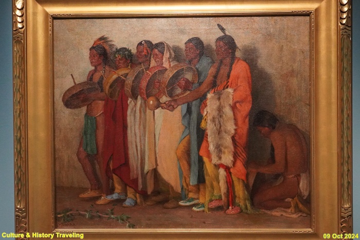 조지프 H. 샤프는 대평원의 풍경과 북미 원주민 문화에 매료되어 1902년 대평원 원주민이 사는 몬태나주로 이주했습니다. 그는 몇 년 동안 블랙풋족, 압사로가족, 다코타족, 네즈퍼스족 등 대평원의 원주민 부족들을 그렸습니다. 1912년 뉴멕시코주로 이주한 뒤로는 푸에블로족의 삶을 그리는 데 집중했습니다. 이 그림은 그가 푸에블로족의 삶을 기록한 수천 점의 그림 중 하나입니다. 그림에 표현된 푸에블로족 남성은 북과 딸랑이를 들고 있어 작가가 목격한 공동체 춤이나 의식의 일부였음을 알 수 있습니다. (안내문, 중앙박물관 특별전, 2024년)