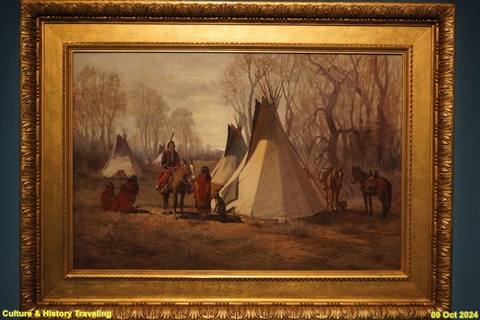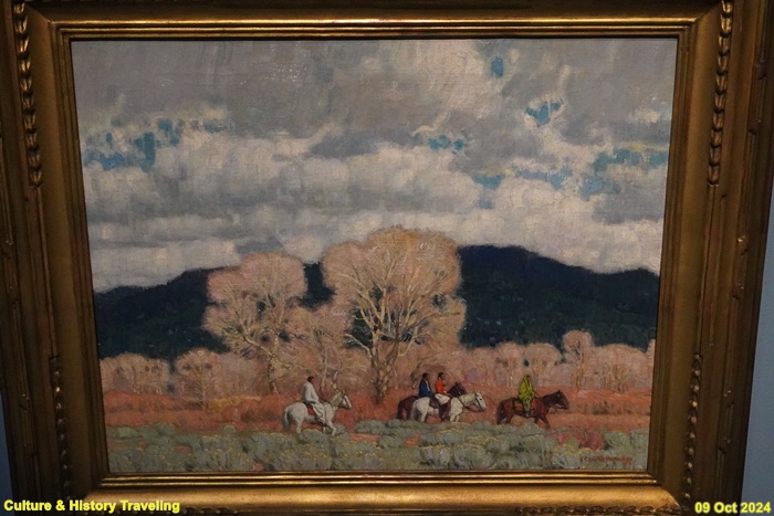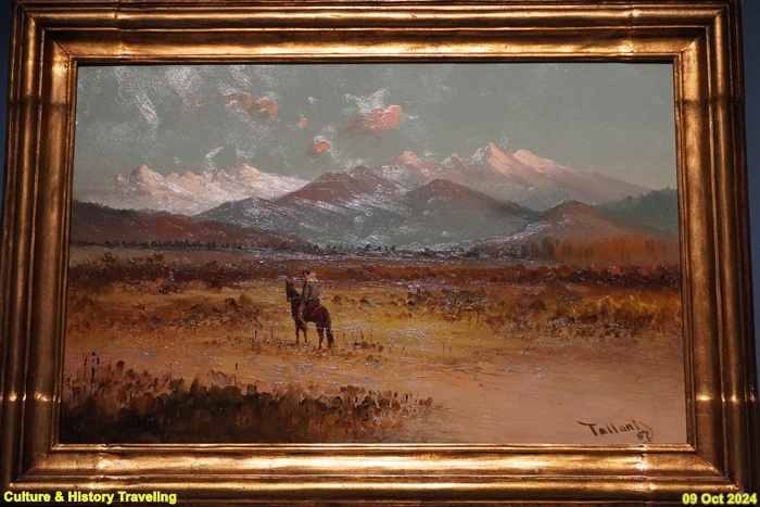 미국 오하이오주 제인즈빌에서 태어난 화가 리처드 탤런트는 주로 혼자 말을 타고 있는 사람을 그렸습니다. 미국 서부의 다양한 풍경을 그렸는데 1887년에는 뉴멕시코주의 풍경과 그곳에 사는 푸에블로족 원주민들을 그렸습니다. 1598년 스페인 사람들이 뉴멕시코에 정작하면서 이 지역에 말이 들어왔습니다. 1689년 스페인 사람들이 뉴멕시코를 포기하고 떠나면서 이 지역에 수많은 가축과 말이 남았습니다. 정착생활을 하는 푸에블로족은 말이 많이 필요하지 않았기에 유목생활을 하는 북쪽 평원 원주민들과 말을 거래했습니다. 이후 말은 대평원지역에 빠르게 퍼져나가 이 지역 사람들의 삶을 크게 바꿨습니다. (안내문, 중앙박물관 특별전, 2024년)