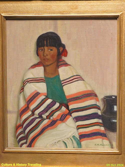 1900년대 초 서부 지역에 정착한 이주민 예술가들은 북미 원주민이 만든 직물과 도자기는 물론 그들의 삶에 큰 매력을 느꼈습니다. 그림 속 소녀는 작가가 자주 그린 북미 원주민의 딸이었을 수 있지만 정확한 정보는 알 수 없습니다. 덮개에 초점이 맞추었고 소녀는 표정이 없습니다. 이주민 예술가는 원주민을 움직이지 않고, 조용하며, 감정을 드러내지 않는 사람들로 그렸습니다. 그래서 원주민을 잘 모르는 사람들은 원주민이 늘 아무런 표정도 짓지 않는다고 생각했습니다. 이런 그림들은 미국 서부로 땅을 넓히려는 사람들에게 보내져 원주민에 대한 잘못된 생각이 계속 퍼지게 하는데 사용되었습니다. 이주민들이 원주민을 조용하고 움직이지 않는다고 생각해야 원주민을 살던 곳에서 쫓아내고 그 땅을 사용하는 데 도움이 됐기 때문입니다. (안내문, 중앙박물관 특별전, 2024년)