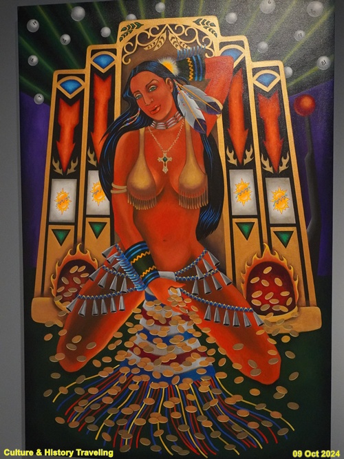 캘리포니아 출신의 원주민 예술가 주디스 로우리는 오랜 세월 부족이 모여 사는 땅에 카지노가 들어서면서 원주민 공동체가 겪은 폐해를 체험했습니다. 그녀는 카지노가 원주민 공동체에 가져온 탐욕과 부패를 표현하고, 카지노 비리를 폭로하려다 죽임을 당한 사촌을 추모하려고 이 그림을 그렸습니다. (안내문, 중앙박물관 특별전, 2024년)