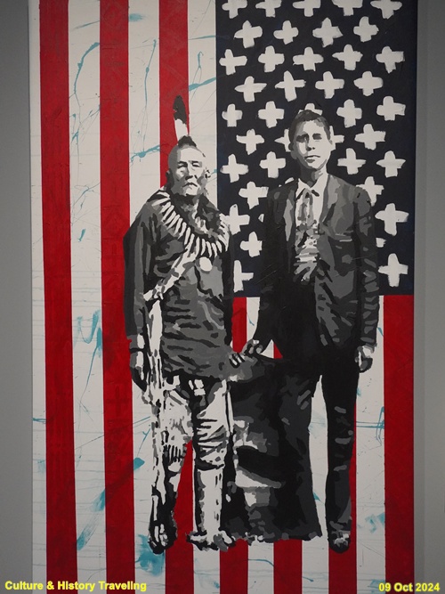 원주민 출신인 작가 그레그 딜은 미국 국기를 배경으로 원주민 복장을 한 남자와 양복을 입은 남자를 그렸습니다. 그는 〈신원을 알 수 없는 백인과 함께 있는 원주민 남자>라는 제목의 역사적 사진을 참조했는데, 성조기의 별 무늬는 작가가 속한 부족의 바구니 무늬로 바꿔 표현했습니다. 여기 두 남자는 조지 키케하키(왼쪽)와 그의 아들 윌리엄 폴락(오른쪽)으로 모두 포니족 출신입니다. 미국 정부는 원주민을 미국 사회에 강제로 동화하려 했고, 그 과정에서 원주민들은 정체성 혼란 등 많은 어려움을 겪었습니다. 작가는 이 작품에서 원주민을 보는 고정관념의 위험성과 원주민으로 ‘보인다’는 것이 무엇을 의미하는지 생각해보게 합니다. (안내문, 중앙박물관 특별전, 2024년)