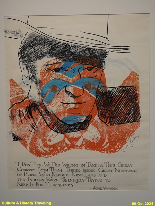 이 그림은 고전 서부 장르 영화 <역마차>(1939)를 1966년에 리메이크한 작품을 광고하는 일러스트입니다. 역마차>(1966)는 1880년 역마차 운전사 두 명이 애리조나주에서 뉴멕시코주로 이동하는 모습을 담았습니다. 영화에 나오는 북미 원주민은 영화 내내 아무 이유 없이 정착민을 공격하는 ‘극단적이고 단순한 야만인’으로 묘사됩니다. 이런 이미지는 서부 개척을 장려하고 그곳에 사는 원주민을 쫒아내도 된다는 생각을 하는데 이용되었습니다. (안내문, 중앙박물관 특별전, 2024년)