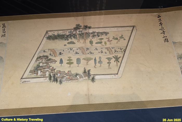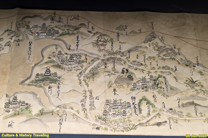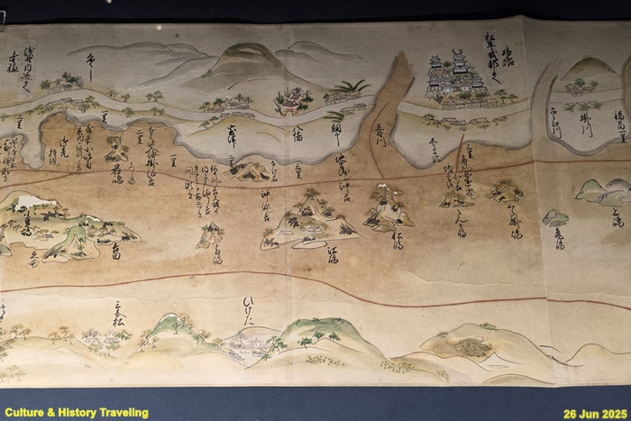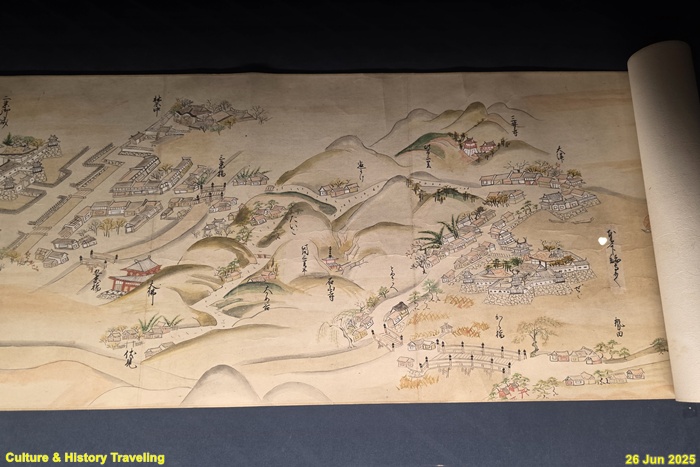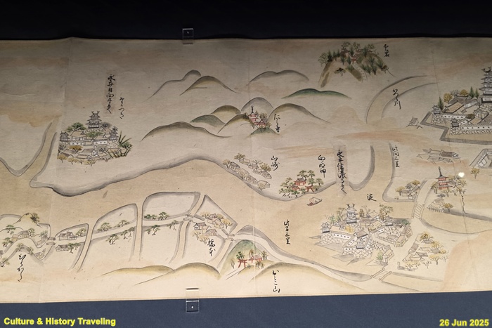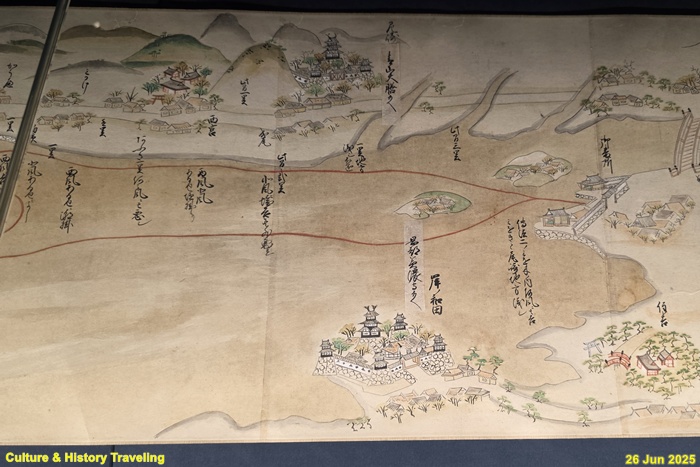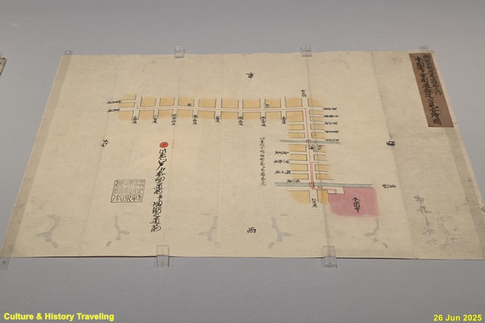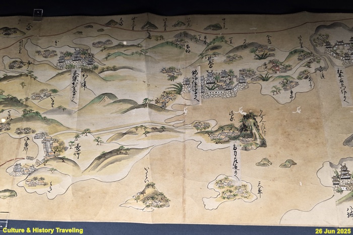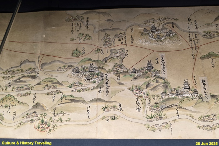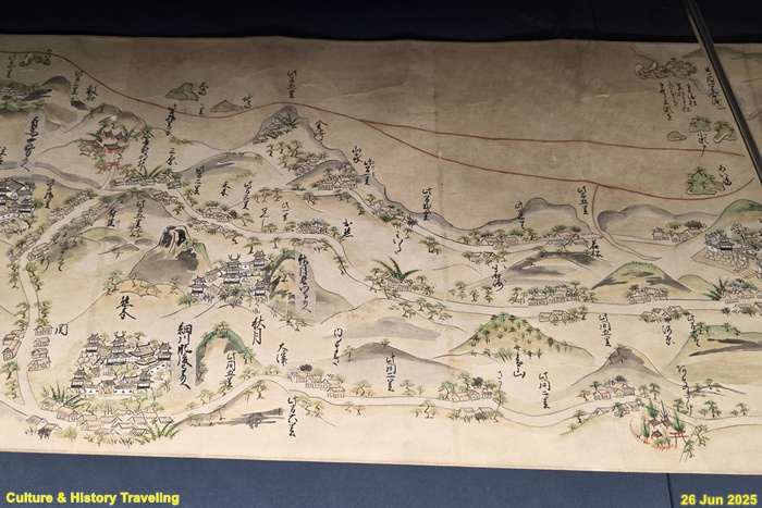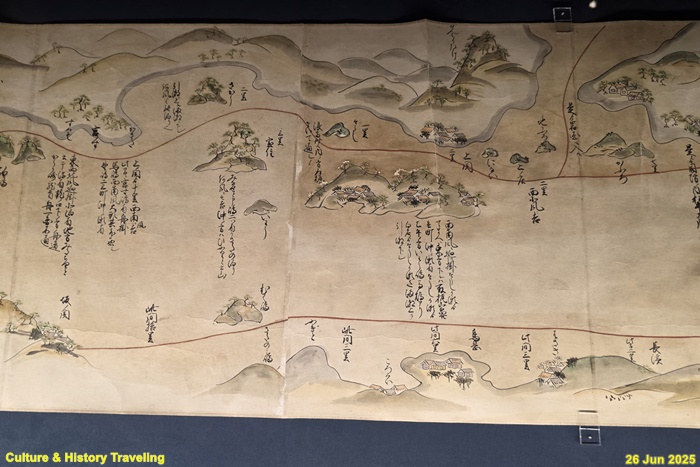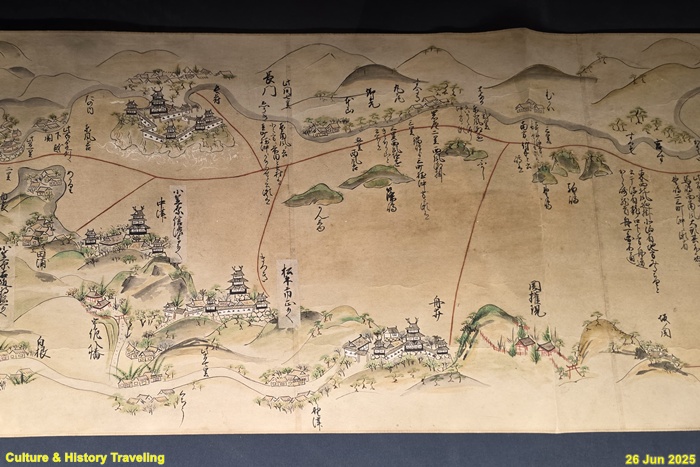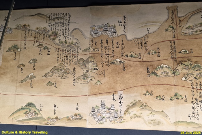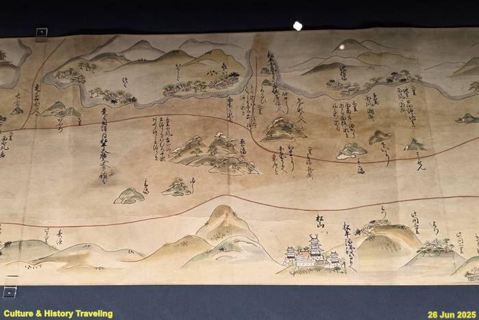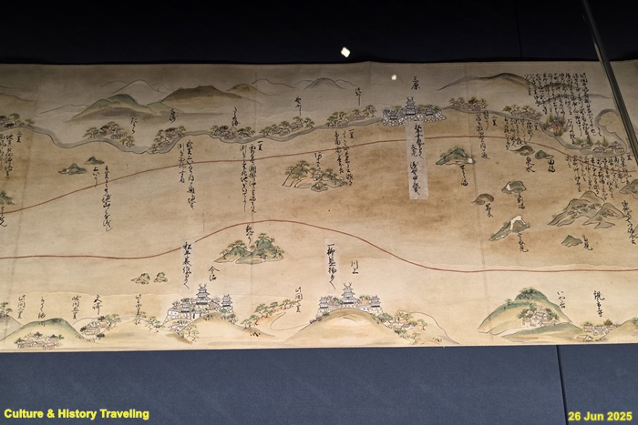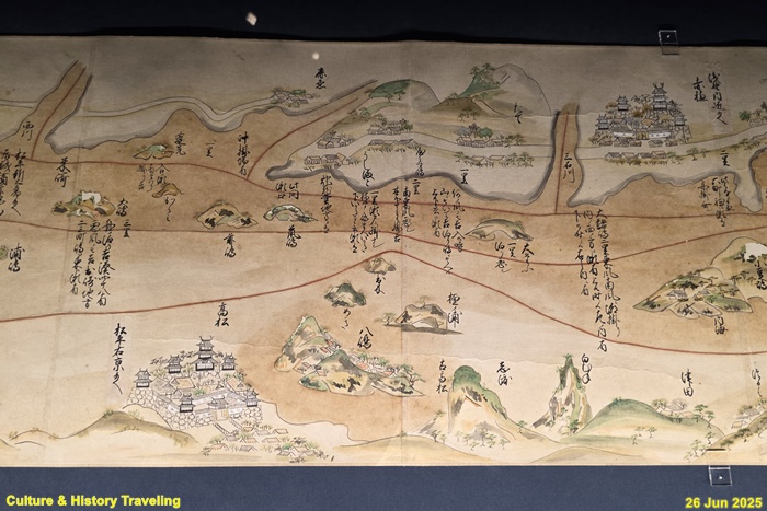이 그림은 통신사 일행의 일본 내 이동 경로를 보여준다. 각 지방의 다이묘들은 원활한 사행을 위해 행로 지도와 연회석 배치도 등을 준비했다. 위 그림은 혼코쿠지(本國寺, 교토의 통신사 숙소)에서 쇼시다이(所司代) 관저로 가는 경로를, 아래 그림은 혼코쿠지에서 에도로 향하는 길과 귀국 경로를 나타낸 것이다. (안내문, 서울역사박물관 특별전, 2025년)