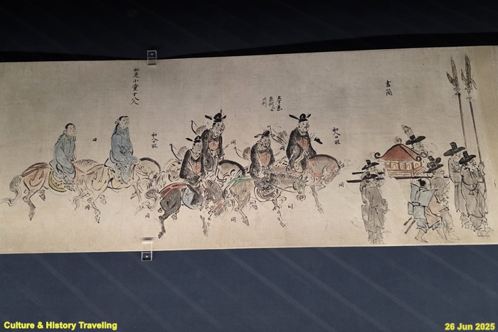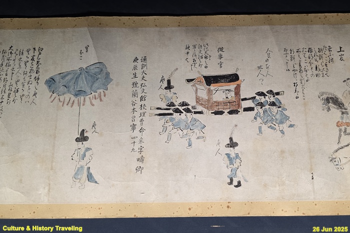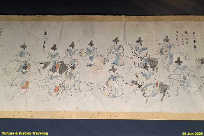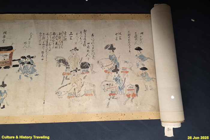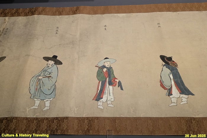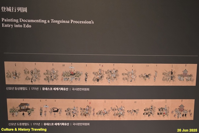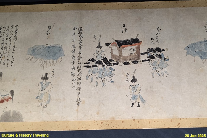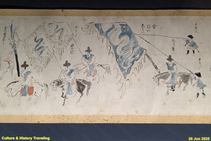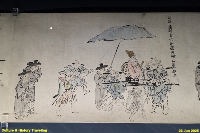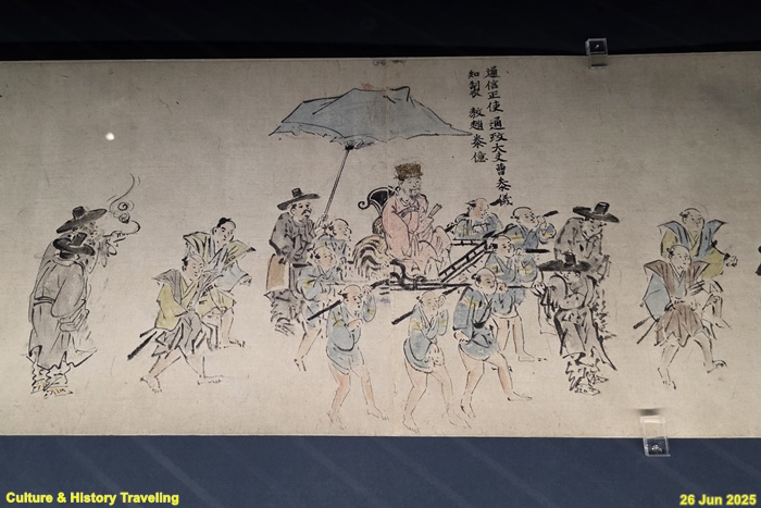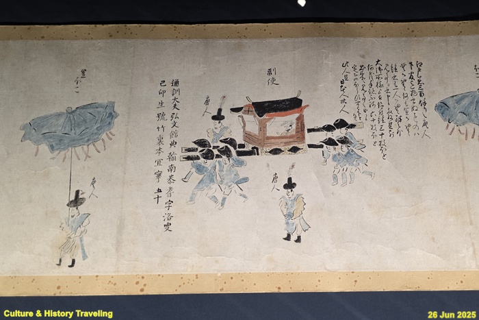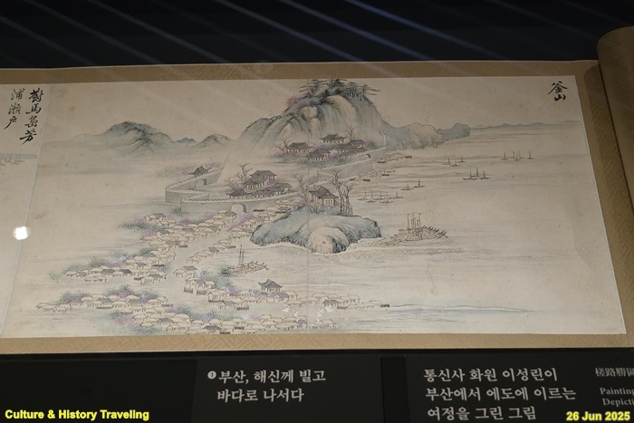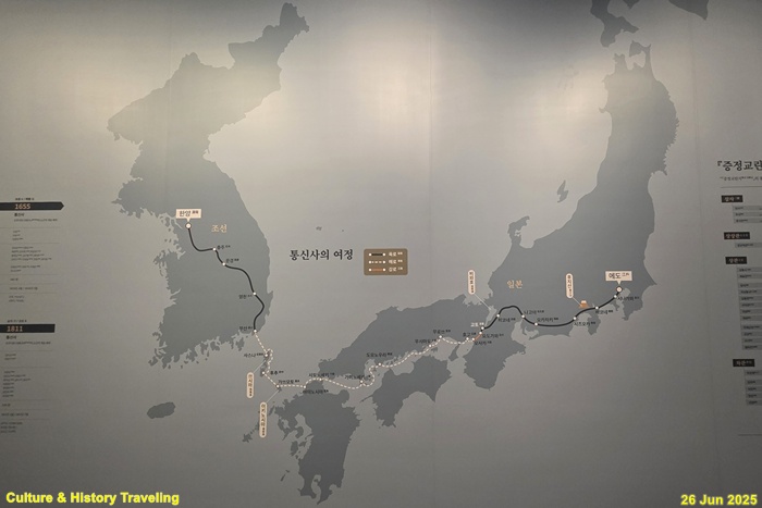왕복 1,470리, 현재 거리로 환산하면 왕복 4,600km가 넘는 대장정이었습니다. 이처럼 통신사의 여정은 단순한 외교 사절단의 이동이 아니라, 장기간에 걸친 국가 간 외교·문화 교류의 상징적인 길이었습니다. (안내문, 서울역사박물관 특별전, 2025년)