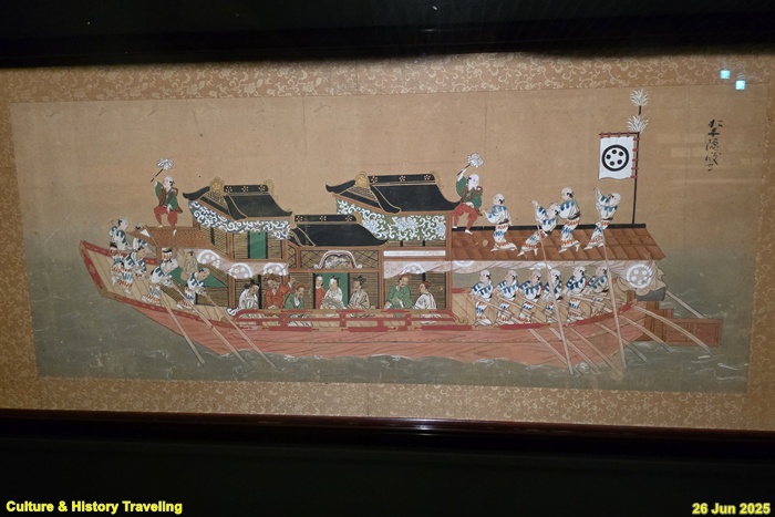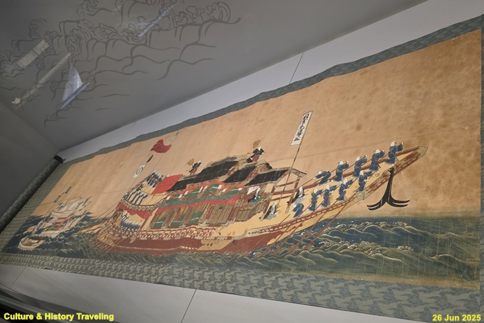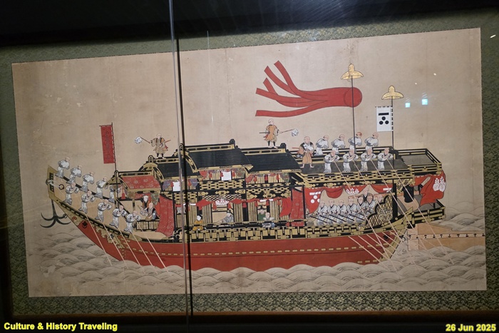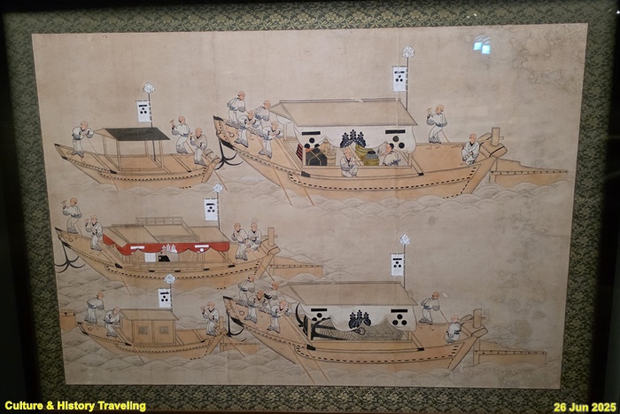이 그림은 마쓰다이라 오키노카미 집안에서 제공한 가와고자부네를 그린 것이다. 가와고자부네는 통신사 일행이 요도가와 강을 따라 교토로 이동할 때 사용한 배이다. 일반적인 수송용 선박과 달리, 공식 사절단을 위해 특별히 장식되고 정비된 배로, 사행의 권위를 상징하는 역할도 하였다. 배 위 깃발에 그려진 문양은’마루노우치고세’, 즉 원 안에 다섯 개의 별이 그려진 것으로, 이는 마쓰다이리 가문의 벚꽃 문양을 의미하는 것으로 보인다. (안내문, 서울역사박물관, 2025년)