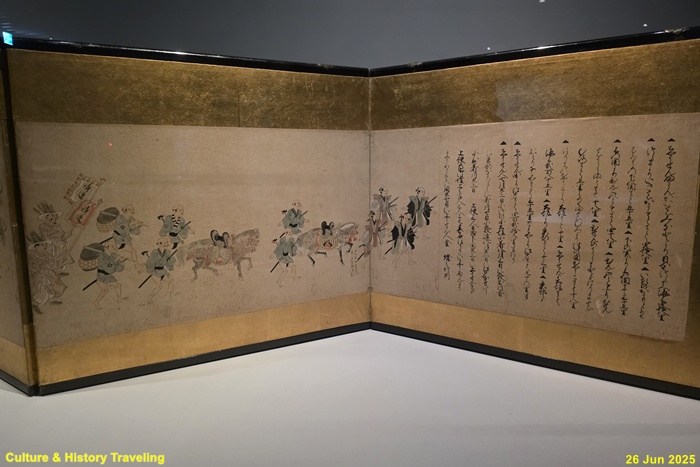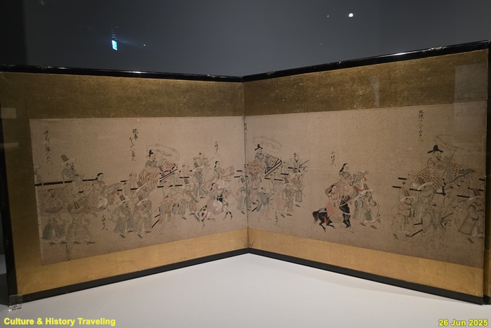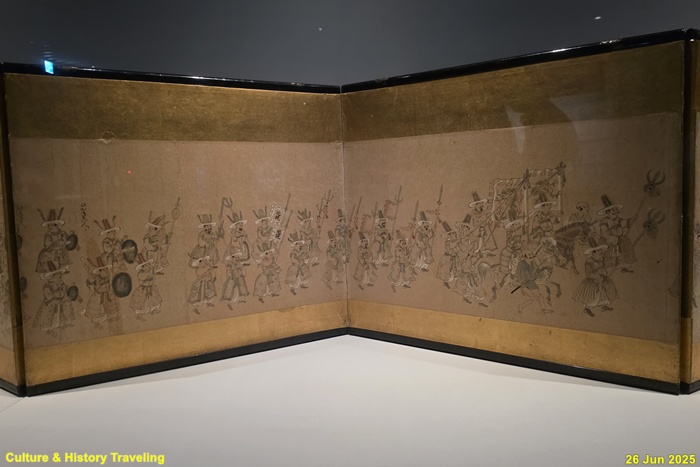 조선 국서를 전달하기 위해 제10차 통신사행이 에도성에 입성하는 모습을 그린 것이다. 제10차 통신사는 도쿠가와 이에시게의 쇼군직 계승 축하를 위해 475명이 파견되었으며, 행렬을 구경하던 인물 중 한 명이 인상 깊었던 장면을 기억해 그린 작품으로 보인다. 행렬 선두에는 쇼군에게 보낼 호랑이·표범 가죽이 놓여 있으며, 기록에 따라 두 개의 국서가마가 표현된 점이 특징적이다. 또한 행렬 방향이 다른 행렬도들과 반대로 묘사되어 있다. 무엇보다 이 그림은 당시 일본 민중이 통신사를 바라본 시각을 생생하게 담고 있다. 에도 방문은 통신사 방일의 하이라이트였으며, 몇십 년 만의 장관을 보기 위해 많은 사람들이 몰려들었다. 흡연을 즐기는 통신사, 예상보다 나이가 많은 소동, 구경 인파로 인해 장사가 어려웠던 에도의 상황 등 다양한 이야기를 해학적으로 표현했다. (안내문, 서울역사박물관 특별전, 2025년)