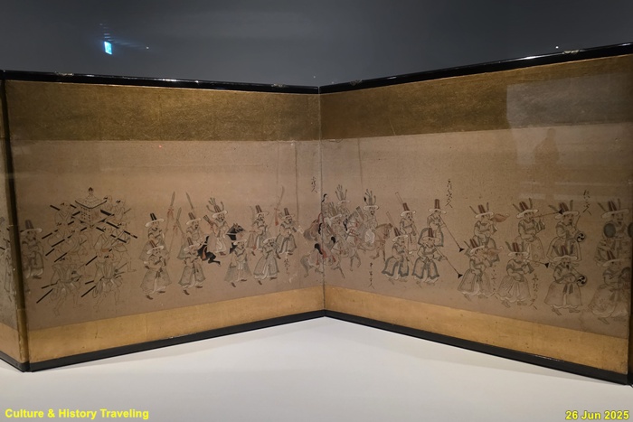 이 그림은 제7차 통신사행이 에도성에 입성하는 모습을 그린 것이다. 앞쪽에는 부산-에도 간 거리, 각 기항지 간 거리, 오사카-에도 여정 등이 기록되어 있어 통신사에 대한 정보를 제공한다. 제7차 통신사 일행은 도쿠가와 쓰나요시의 쇼군직 계승을 축하하기 위한 목적으로 총 인원 473명이 파견되었다. 행렬은 일본인 호행자를 선두로 청도기, 형명기가 이어지며, 그 뒤로 국서가 실린 가마가 따른다. 정사 윤지완, 부사 이언강, 종사관 박경후가 이름과 함께 묘사되었으며, 하관 등은 직책과 인원수만 기록되었다. 핵심 인물과 행렬 순서가 정리되어 있어 이전 도시도 병풍보다 발전된 모습을 보인다. 또한, 사행원의 복식이 중국풍이고, 소동은 우키요에 미인도 스타일로 묘사된 점으로 미루어보아 우키요에 화가에 의해 제작되었을 가능성이 크다. 삼사를 제외한 사행원들은 과장된 갓과 외모를 통해 이국적인 이미지를 강조했으며, 원래 두루마리였던 그림을 병풍으로 재구성한 것이다. (안내문, 서울역사박물관 특벼전, 2025년)