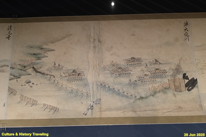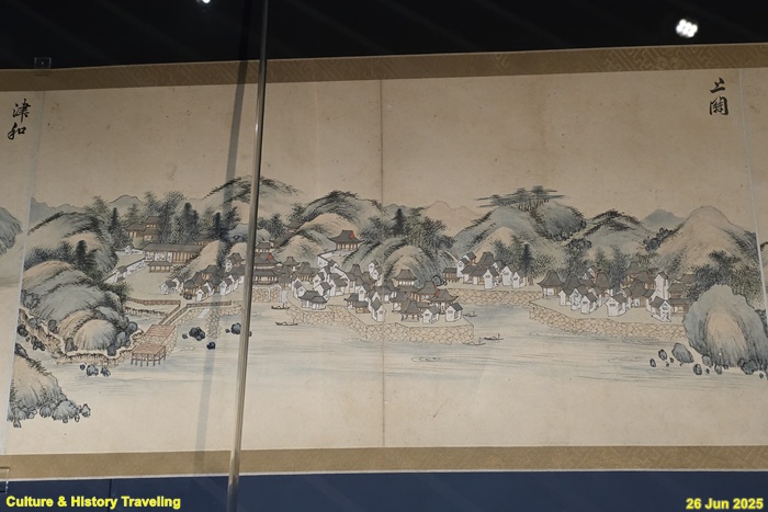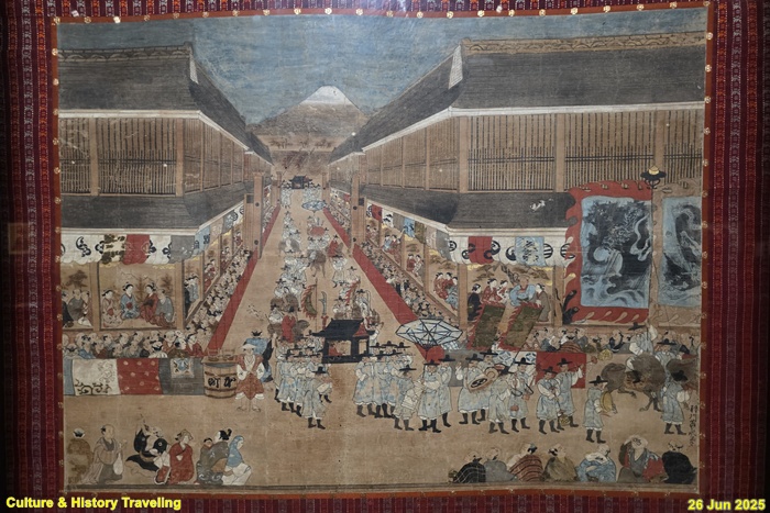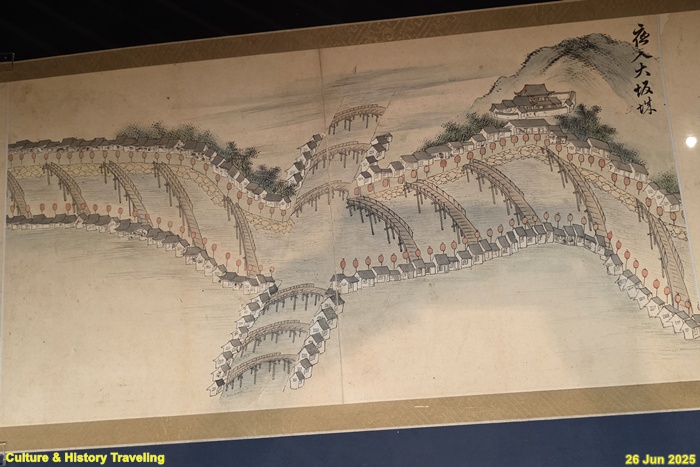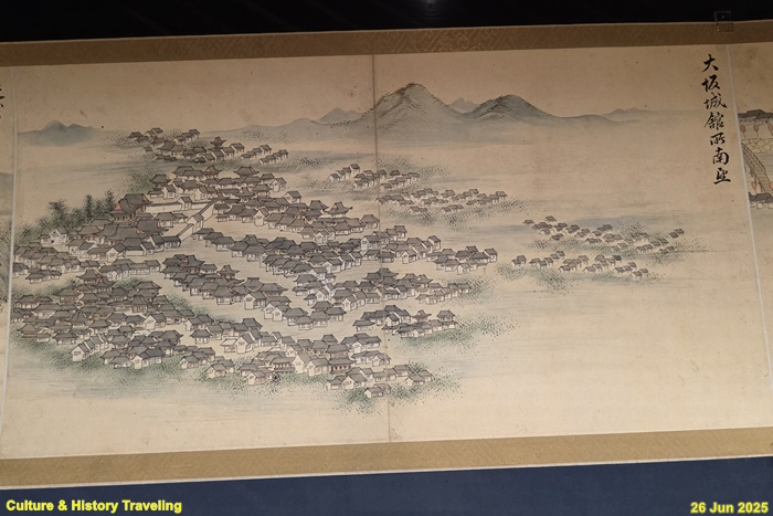 오사카는 세토 내해의 마지막 기착지이자 육로 이동의 출발점이었다. 통신사는 오사카에 조선에서 타고 온 큰 배를 정박시키고, 일본이 제공한 ‘가와고자부네川御座船’로 갈아타 요도가와 강을 거슬러 이동했다. 이 그림은 제8차 통신사행 때 상상관이 탄 제3선과 공선 5척이 요도가와 강을 오가는 모습을 담고 있다. 배에 새겨진 문장을 통해 모리가毛利家에서 제공한 것임을 알 수 있으며, 이는 오사카성을 관리하던 도키 요리타카가 기록을 위해 그리게 한 것으로 추정된다. (안내문, 서울역사박물관 특별전, 2025년)