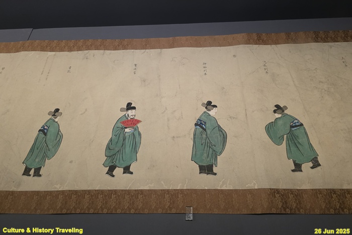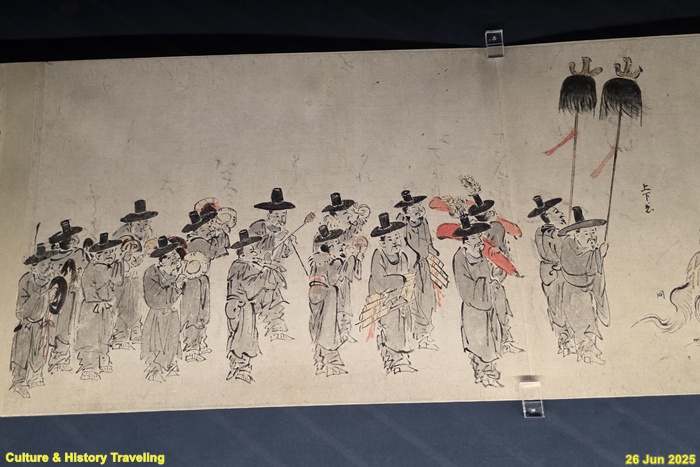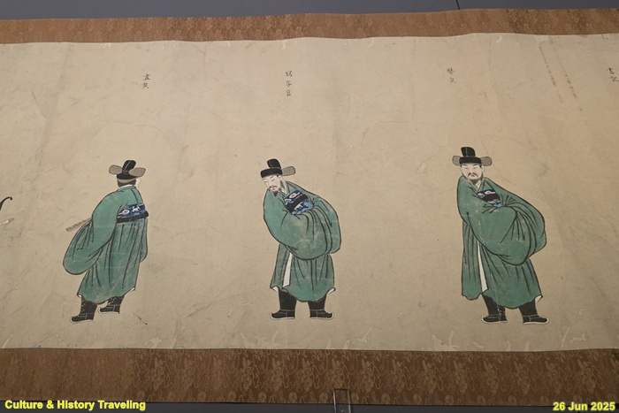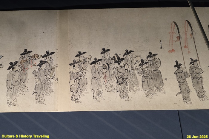 이 그림은 국서 전명식에서의 통신사 복식을 묘사한 작품이다. 신미 통신사는 마지막 사행으로, 의례 장소가 에도에서 쓰시마로 변경되어 전명식이 쓰시마 도주의 저택에서 거행되었다. 그림에는 정사, 부사, 상관, 중관, 하관, 격군 등 총 38명의 복식이 직분에 따라 자세히 그려졌다. 정사와 부사는 금관에 붉은색 조복, 상관은 사모에 단령을 착용하고 있으며, 인물들이 들고 있는 의장 및 지물도 직분에 맞게 표현되었다. 외교 의례에서 통신사의 복식은 일본인들에게 많은 관심을 받았다. ‘소중화’를 자처했던 조선의 복식은 일본인들에게도 중화 문명인 명의 제도가 남아있는 유일한 예로서 높이 평가되었기 때문이다. 이전에 사행원의 복식 그림은 문집 내에 삽화 형식으로 수록되었으나, 1811년에는 두루마리 형식의 그림으로 제작되며 더욱 정교하게 기록되었다. (안내문, 서울역사박물관 특별전, 2025년)