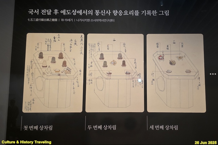 자료에 있는 상차림에서 볼 수 있듯이 조선통신사에 대한 에도막부의 대접의 상당히 융숭했음을 알 수 있다. 오늘날 볼 수 있는 일본 전통음식들과 비슷하다. 야채와 생선 위주로 구성되어 있으며 육식은 통신사 수행인원이 직접 요리를 했다고 한다.