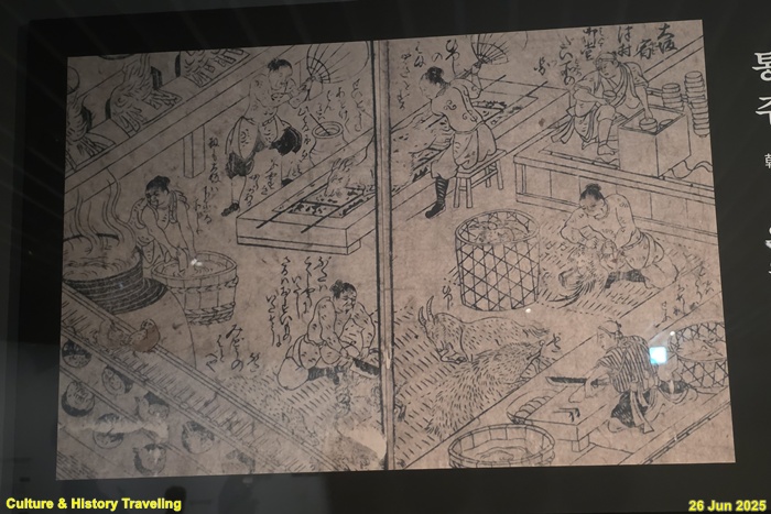 오사카에 위치한 통신사의 숙소, 키타미도北御壁에는 육식을 좋아하는 통신사 일행을 위해 넓은 주방을 특별히 설치했다. 주방의 중앙에는 큰 구이대가 설치되어 있고, 조선인이 통구이를 조리하고 있다. 오른쪽의 높은 곳에서는 일본인 요리사가 통신사의 육식 조리를 신기한 듯 보면서 그릇을 준비하고 있다. (안내문, 서울역사박물관 특별전, 2025년)