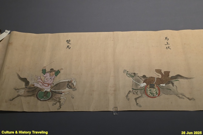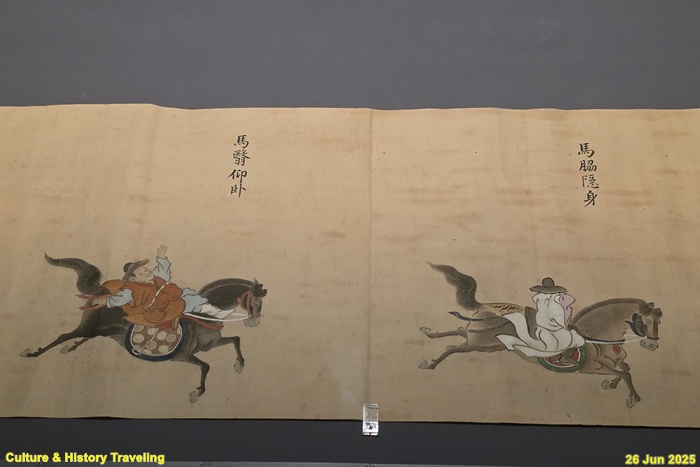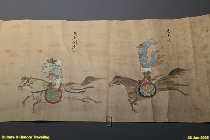 이 그림은 통신사 파견 시 에도에서 공연한 마상재馬上를 묘사한 것이다. 조선은 예로부터 기마술이 발달했으며, 이를 좋아한 3대 쇼군 도쿠가와 이에미쓰의 요청으로 1636년부터 마상재 기마수들이 통신사 사행에 동행하게 되었다. 마상재는 에도성 내에서 공연되었으나, 영천과 쓰시마에서 예행 연습을 하기도 했다. 쇼군을 비롯해 다이묘에서 서민들까지 모두가 보고 싶어하는 공연이었다. 이를 위해 기마수를 통신사보다 먼저 파견하기도 했고, 에도성 내에 조선마장까지 건립할 정도로 관심이 높았다. 1682년 기록에서 마상재는 8종류였으나, 이 그림에는 여섯 가지 장면이 표현되어 있다. (안내문, 서울역사박물관 특별전, 2025년)