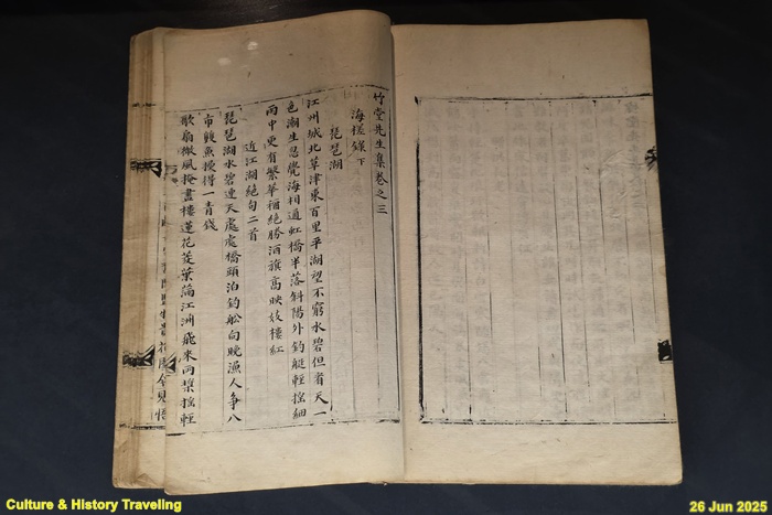 제5차 통신사 종사관이었던 죽당 신유의 시문집이다. 신유는 청나라 심양, 연경, 북경, 일본 에도를 방문하며 국제적 감각을 익힌 인물이다. 제5차 통신사는 도쿠가와 이에쓰나의 탄생을 축하하기 위한 목적으로 총 477명의 인원이 파견되었다. 책 중 <해사록>이 통신사 기록에 해당한다. 같은 고령 신씨 가문의 신숙주가 일본에 통신사 서장관으로 다녀온 업적은 신유에게도 영향을 미쳤다. (안내문, 서울역사박물관 특별전, 2025년)