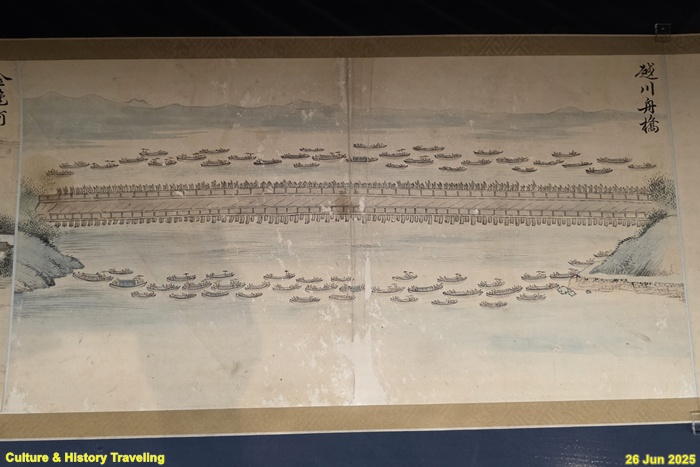 월천주교(越川舟橋)는 시즈오카현에 위치한 오이강(大井川)에 설치되었던 임시 부교라 한다. 오이강은 유속이 빠르고 수량이 많아 다리를 영구적으로 건설하기 어려웠습니다. 평상시에는 인부들이 직접 사람이나 가마를 메고 강을 건너는 ‘카와고시(川越)’라는 독특한 방식으로 도강이 이루어졌다. 그러나 쇼군이나 조선통신사와 같은 최고위급 사절단에는 배를 띄워 주교(舟橋)를 설치하였다고 한다.