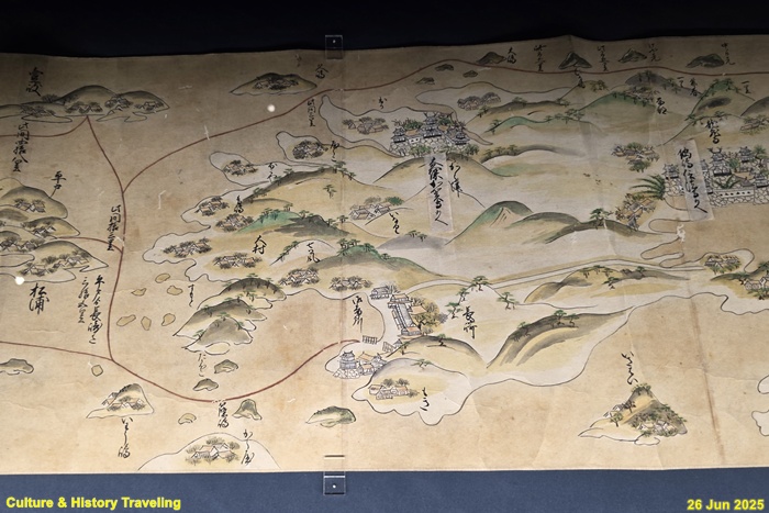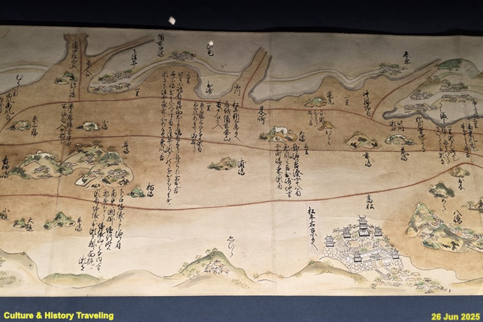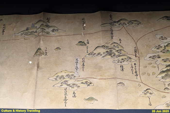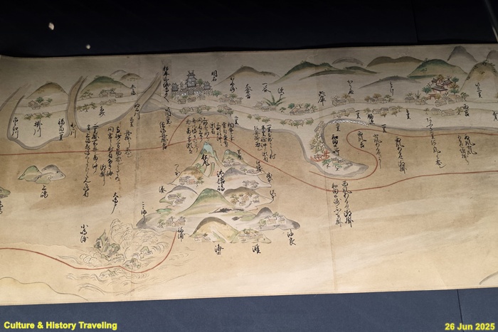 통신사 최종 목적지인 에도에서 조선으로 돌아오는 여정을 상세하게 그린 파노라마 형식의 회화식 지도이다. 1권은 에도에서 교토까지, 전시된 2권은 교토에서 조선까지 일본의 주요 도시와 사찰, 신사 및 명승지 등 풍부한 지리적 정보를 자세하게 담고 있다. 2권 중 오사카성에서부터 조선까지는 세토 내해의 연안을 지나 간몬해협에 이르는 해안선을 따라 붉은 선으로 항로를 표시하고 있다. 통신사가 항해했던 해로뿐 아니라 통신사 일행이 작은 배로 갈아타서 이동했던 주요 거점의 강 지류까지도 붉은 선으로 표현하고 있다. (안내문, 서울역사박물관 특별전, 2025년)