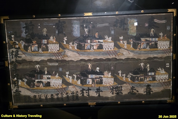 이것은 요도가와 강을 따라 교토에서 오사카로 돌아가는 통신사선이 그려진 에마(納馬)이다. 오사카 인근 돈다바야시의 미구쿠루미타마신사 배전에 걸려 있는 것으로, 1985년경 재일동포 사학자인 신기수의 조사 연구를 통해 학계에 조명되었다. 그림에는 일본에서 제공한 가와고자부네 6척이 두 줄로 배치되어 있다. 상단에는 왼쪽부터 정사·부사·종사관이 탄 배가, 하단에는 국서를 담은 가마를 실은 배와 조선 수행원들의 배가 그려져 있다. 각 배에는 통신사 일행을 비롯해 노를 젓는 사람과 이들을 지휘하는 무사들이 생동감 있게 표현되어 있으며, 일본인들이 배 위에서 통신사를 접대하는 모습도 보인다. 에마의 왼쪽에는 ‘겐로쿠 8년 9월 길일’이라는 봉납 일자가 적혀 있고, 하단에는 ‘키시 사쿠라이촌” 이라는 마을 이름과 함께 ‘弥兵衛, 市蔵,’菊松,小太郎’ 등 농민 11명의 이름이 적혀 있다. 한편, 미구쿠루미타마신사가 위치한 돈다바야시는 백제인이 도래한 마을로도 알려져 있다. 이 신사는 백제 왕족의 후손으로 추정되는 왕인표 씨족과 관련된 씨사로, 백제 왕족의 조상신을 모신 곳으로 여겨진다. 당시 통신사 행렬이 오사카에서 교토로 오고가며 요도가와 강을 지나갈 때, 이를 구경하기 위해 많은 사람들이 모여들었다. 키시 사쿠라이 마을의 농민들도 자신들과 연관이 깊은 조선 사절단을 보기 위해 구경 나왔고, 그 기억을 기념하기 위해 에마를 제작해 신사에 봉헌한 것으로 보인다. 왜 통신사 그림이 신사에 봉헌되었는지는 단정할 수 없지만, 일본 민속문화 속에 통신사가 자연스럽게 녹아들었음을 보여주는 사례라 할 수 있다. 이를 통해 통신사가 일본 민중의 삶과 문화에 얼마나 깊이 스며들었는지 생각해볼 수 있다. (안내문, 서울역사박물관 특별전, 2025년)