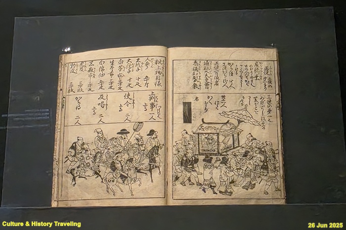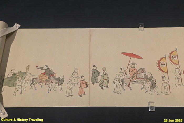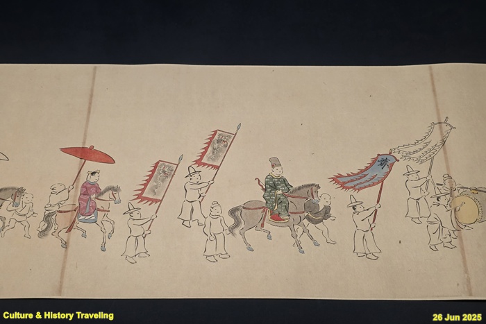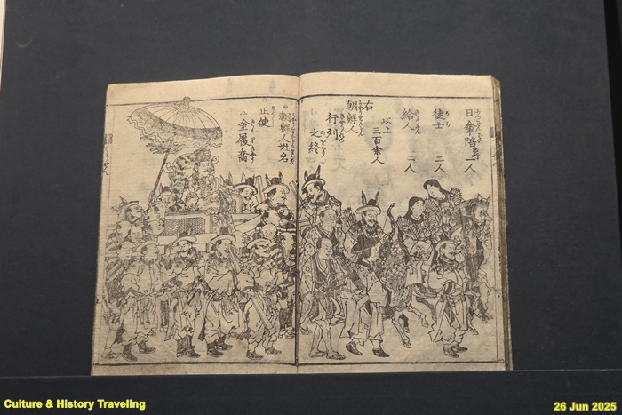 설명을 곁들였다. 이를 통해 관람자가 전체 모습을 쉽게 파악할 수 있도록 하였다. 당시 통신사 행렬 출판물의 간행을 주도한 교토의 기쿠야 시치로베출판사는 다른 안내서와 달리 가와고자부네 행렬과 선박을 묘사한 것이 특징적이다. 이는 가와고자부네로 이동하는 구간에 근접한 지역적 특성을 반영한 것으로 보인다. 당시의 인기를 반영해 사행 도착 10개월 전에 미리 제작했다. 이러한 출판물들은 통신사 방문 전 정보의 습득, 방문시 감상의 편 의를 제공하는 한편, 통신사를 조공사절로 설명하여 왜곡된 인식을 심어주기도 하였다. (안내문, 서울역사박물관 특별전, 2025년)