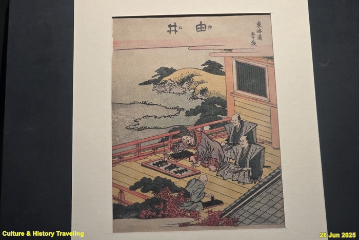 일본의 대표적인 우키요에 화가 가스시카 호쿠사이고로가 그린 통신사 그림이다. <유정>은 통신사의 한 사람이’세이켄지’ 편액을 쓰고 있는 장면으로, 호쿠사이의 <동해도오십삼차> 시리즈에 수록되이 있다. 19세기 초, 에도에서 사행이 더 이상 이루어지지 않던 시기임에도 불구하고, 통신사에 대한 일본인들의 관심은 여전하여 당시 유명한 우키요에 화가들이 이를 주제로 채택하이 그렸다. 통신사복식에서 목과 어깨에 두른 프릴장식은 일본인과는 다른 이국인의 모습을 강조하는 요소로서 그리졌다. (안내문, 서울역사박물관 특별전, 2025년)