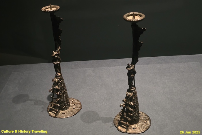 깃발을 든 통신사 행렬을 모티프로 한 촛대이다. 일본에서는 이러한 정교한 주물 공예품을 ‘벳부세공’이라고 부르는데, 18세기 후반 현재의 기후현 미즈호시 벳부에서 제작된 납형주물세공이라는 뜻에서 생산지명을 따서 그렇게 불렀다. 벳부세공에는 이 작품 외에도 통신사의 악공이나 담배를 피우는 모습을 담은 화병 등도 있다. 이러한 사례를 통해 당시 통신사 행렬에 대한 관심과 그 모티프의 유행을 엿볼 수 있다. (안내문, 서울역사박물관 특별전, 2025년)
