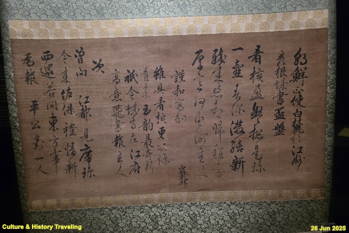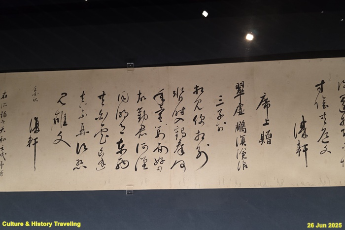 제10차 통신사행의 사자관 김계승이 쓴 시이다. <고화비고>에 “무진년 어느 달, 조선국의 진광 김계승이 쓰다 .”라는 낙관이 게재되어 있어, 일본에 작품을 남겼음을 알 수 있다. 이덕무는 <청장관전서>에서 그에 대해 “필법이 기이하고 뛰어나며, 사람됨이 대쪽 같고 호탕하다.”라고 기록했다. (안내문, 서울역사박물관 특별전, 2025년)