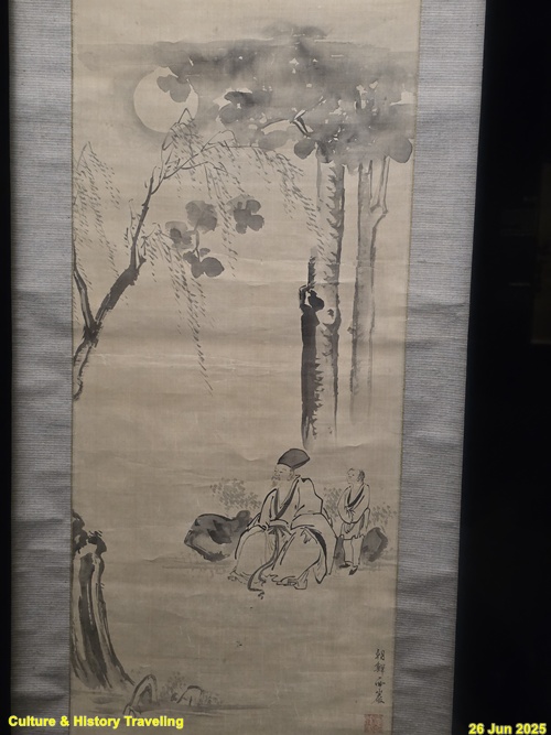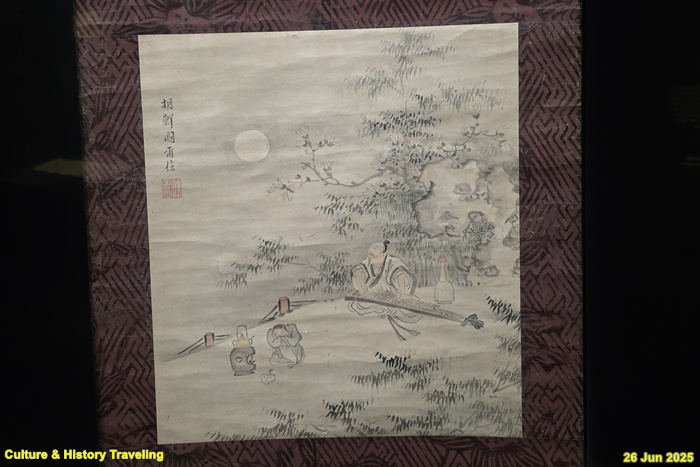 마지막 통신사행의 화원으로 쓰시마에 다녀온 이의양의 그림이다. 달빛 아래 거문고를 타는 고사와 차를 끓이는 동자의 모습을 청신한 운치로 그려냈다. 이름 앞에 ‘조선국’이라는 표현은 사행원들이 일본에서 서화를 제작할 때 반복적으로 썼던 용어이다. (안내문, 서울역사박물관 특별전, 2025년)