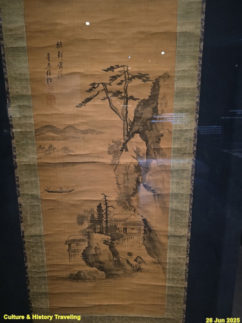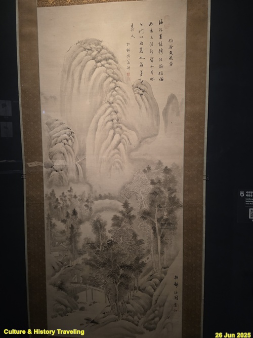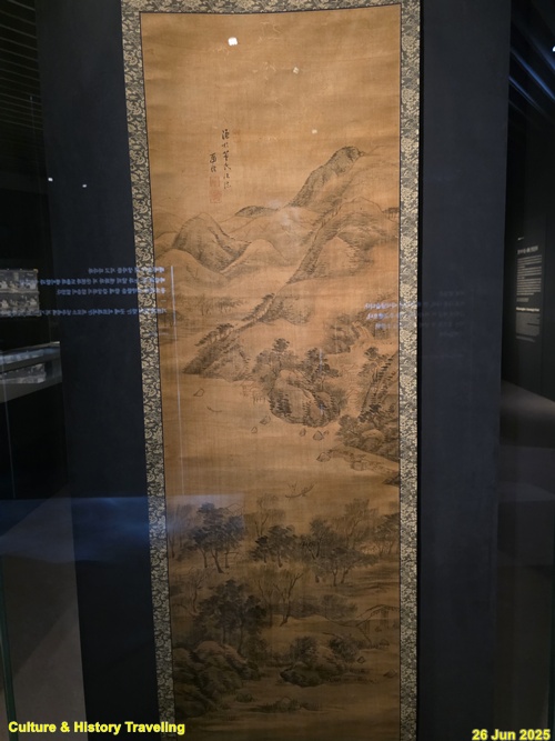 마지막 통신사행의 화원으로 쓰시마에 다녀온 이의양의 산수화이다. ‘동씨의 활법에 유래한다”는 그림 속의 글처럼 중국 송대 화가 동원의 화풍을 따랐다. 윤곽선을 그리지 않고 묵점을 찍어 습윤한 중국 강남의 산수풍경을 그려냈다. (안내문, 서울역사박물관 특별전, 2025년)