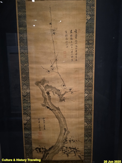 제11차 통신사행의 기선장 변박이 그린 매화 그림이다. 왼쪽 하단에 “갑신년 초여름 일본에서 술재가 그리다.”라고 적혀 있어, 1764년 통신사행 당시 그린 것으로 추정된다. 휘어진 매화 나무 위로 성글게 핀 매화 꽃가지를 간결한 수묵의 필치로 묘사하여 문인적 분위기가 강하게 드러난다. (안내문, 서울역사박물관 특별전, 2025년)