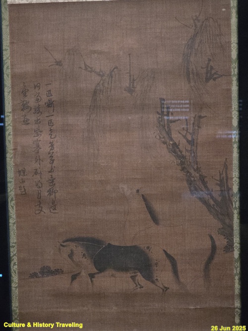 제5차 통신사행 화원 이기룡의 그림이다. 도화서 화원이었던 그는 1643년 김명국과 함께 일본으로 건너갔다. <고화비고>에는 그들이 하야시 라잔의 아들 형제에게 두 점의 그림을 그려주었다는 내용이 전해진다. 이 그림은 버드나무 아래 두 필의 말이 노니는 장면을 그린 것으로, 조선 중기 화단에서 유행한 절파浙派 화풍이 반영되어 있다. 또한 함께 통신사로 갔던 제술관 박안기의 화제가 적혀 있다. (안내문, 서울역사박물관 특별전, 2025년0
