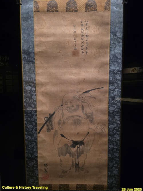 김명국이 제5차 통신사행의 화원으로 파견되었을 당시 호방한 수묵화풍으로 그린 포대화상 그림이다. 그는 1636년 통신사 수행 중 일본에서 큰 인기를 얻었으며, 일본 측 요청으로 1643년에 다시 파견되었다. 포대화상은 당 말기 중국 남부에 실존했던 승려로, 일본에서는 칠복신 중 하나로 숭배되었다. 이 작품의 화제는 제술관 박안기가 적었다. (안내문, 서울역사박물관 특별전, 2025년)