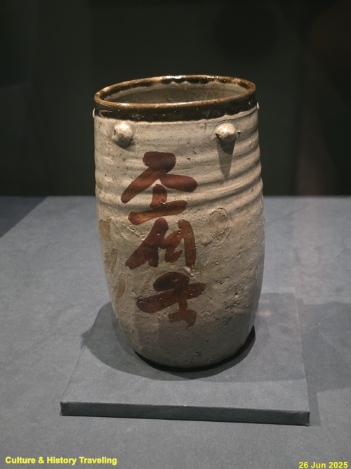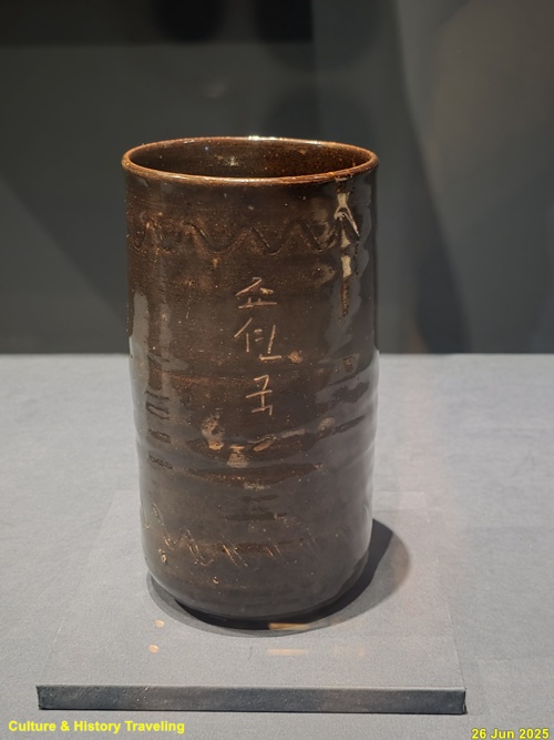 ‘조션국’이라는 한글이 새겨진 흑자 병으로, 이테이안 윤번제와 관련하여 쓰시마에 남아 있던 조선 도자기가 전해진 것으로 추정된다. 특히 보관 상자 겉면에는 “쓰시마 세이잔지 에서 전해진 것”이라는 내용이 적혀 있어, 이테이안이 설치된 사찰인 세이잔지와의 연관성을 뒷받침한다. 유약이 빛나는 흑유체 위에 ‘조션국’이라는 한글이 서툰 필치로 새겨져 있다. 이러한 형태의 도자는 조선에서는 찾아보기 어려운 디자인이지만, 바닥에 거칠게 뿌려진 모래 등의 특징을 통해 조선에서 제작되어 일본으로 보내진 것으로 추정된다. 도자기에 한글을 새긴 것은 당시 일본에 방문한 통신사에게 한글을 요구한 것과 마찬가지로, 이테이안 윤번승들이 조선의 글씨를 좋아한 것과 관련있어 보인다. 특히 조선의 도자는 일본에서 높이 평가되던 제품으로 ‘조선제’를 강조하기 위해 국명을 새겨 넣었을 가능성도 있다. (안내문, 서울역사박물관 특별전, 2025년)