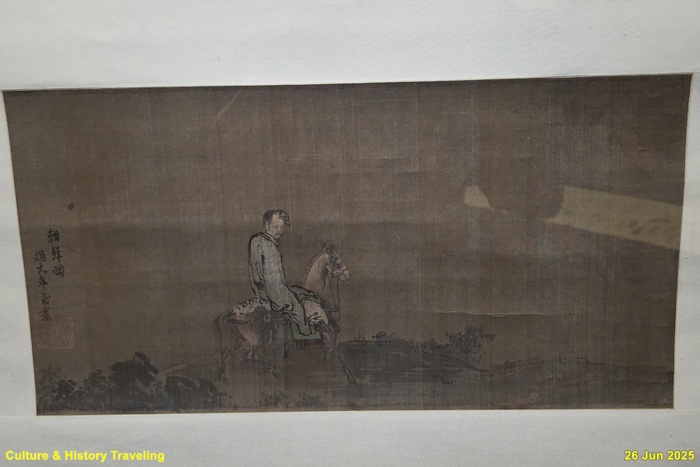 제8차 통신사행의 정사 조태억이 그린 것으로 추정되는 기마인물도이다. 말을 타고 가는 인물을 통해 자연을 벗 삼아 은일을 즐기는 모습을 표현했다. 한편 조태억은 사행에 동행했던 쇼코쿠지의 벳슈 소엔 스님과 막부 측근의 정치가이자 학자였던 아라이 하쿠세키와 교류했다. (안내문, 서울역사박물관 특별전, 2025년)