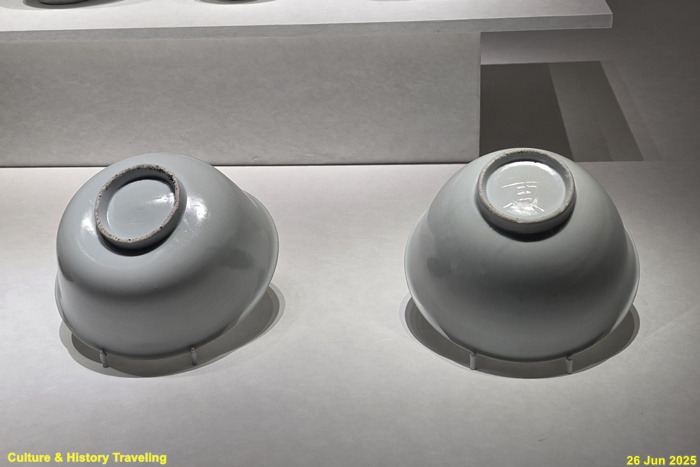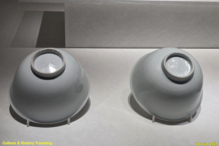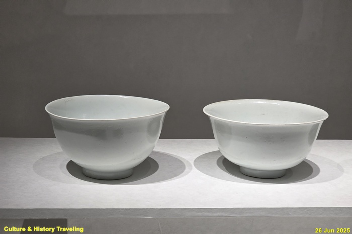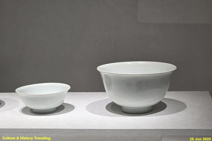 크기가 크고 정제된 형태를 갖춘 전형적인 조선 전기 순백자 사발입니다. 굽바닥에 각각 ‘천天’ . ‘지地’· ‘현玄’ . ‘황黄’ 글자를 음각한 점이 눈에 뜁니다. 조선 전기 관요 순백자에서는 여러 종류의 명문이 발견되었습니다. 그중에서도 ‘천’· ‘지’· ‘현’ · ‘황’은 관요의 운영체제와 관련하여 백자의 제작과 수납, 출납과 관련하여 사용한 것으로 보입니다. (안내문, 중앙박물관 특별전, 2025년)
