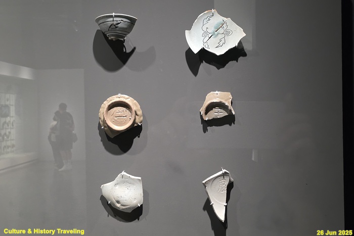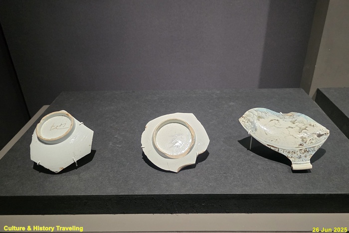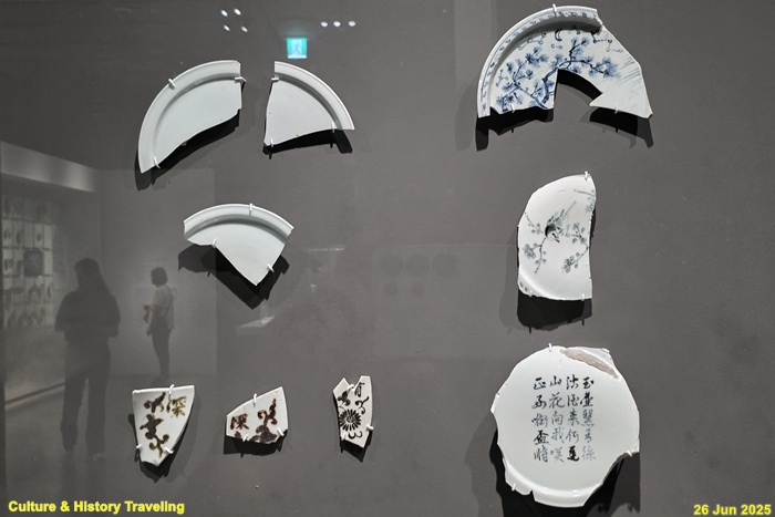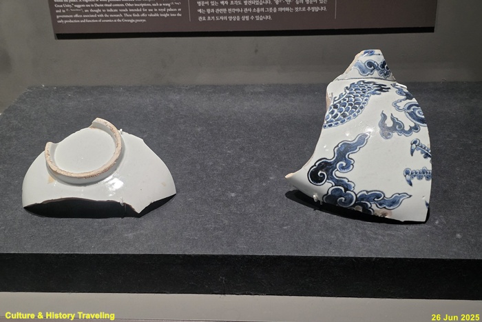 1964~1965년 발굴조사를 통해 순백자와 청화백자 뿐 아니라 상감백자.분청사기 등이 확인되었습니다. 순백자 중에서 양질의 대접과 접시의 굽바닥에는 ‘천天’·’지地’· ‘현玄’· ‘황黄’ 등의 명문이 있는 경우가 많습니다. 청화백자는 전접시의 비중이 가장 높은데, 한시漢를 비롯하여 별자리·소나무 · 매화 · 대나무 ·새 등이 주요 소재가 되었습니다. 좋은 청화색을나타내기 위해 시험한 것으로 보이는 안료의 다양한 시험번조편이 출토되어 주목됩니다. (안내문, 중앙박물관 특별전, 2025년)