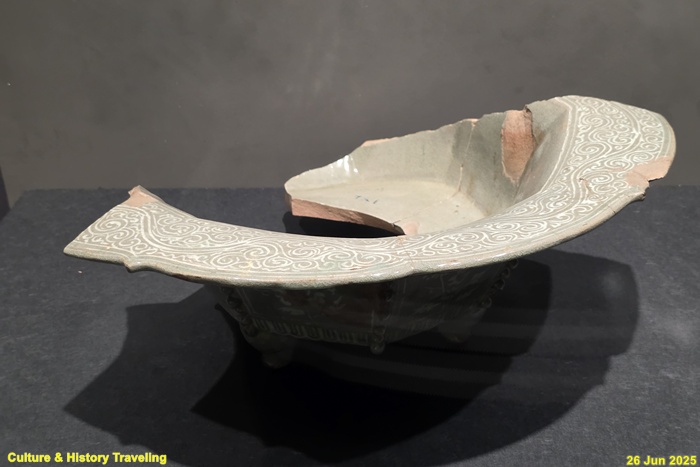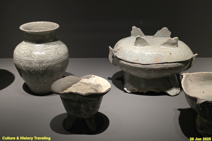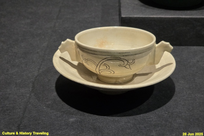 이 분청사기 철화 번개무늬 보와 조화 인물무늬 작은 충청남도 공주 학봉리 가마터에서 발굴되었습니다. 보는 『세종실록』「오례」 제기도설 및 『국조오례의서례』에 수록된 금속 제기 보를 따랐으나, 세부 표현에서 차이를 보입니다. 작은 제사상 제일 앞에 놓여 술을 올리는 술그릇으로 쓰입니다. 이 조화분청사기 작 역시 제기도설의 작과는 세부에서 차이를 보입니다. 엄격하고 정제된 국가의례가 아닌, 지방 의례의 모습을 가늠케 해줍니다. (안내문, 중앙박물관 특별전, 2025년)