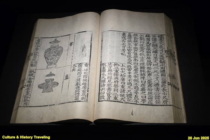 1474년(성종 5) 편찬된 의례서로 국가 의례 전반의 기준을 마련한 『국조오례의』와 짝을 이룹니다. 이 책에 수록된 길례 제기도설祭器圖説, 가례 ·빈례 준작도설尊爵圖說 등은 당시 정비된 의례기의 형식과 조형을 보여준다는 점에서 주목됩니다. 제기는 금속으로 만드는 것이 원칙이었으나 조선 초에는 금속이 부족해 경제적이고 제작이 쉬웠던 도자제기가 만들어지게 되었습니다. 일부 의례에는 의도적으로 도자제기가 선택되기도 했으며, 분청사기는 도설에 제시된 복잡한 문양들을 표현하는 데에 적합한 기법상의 장점도 가지고 있었습니다. (안내문, 중앙박물관 특별전, 2025년)