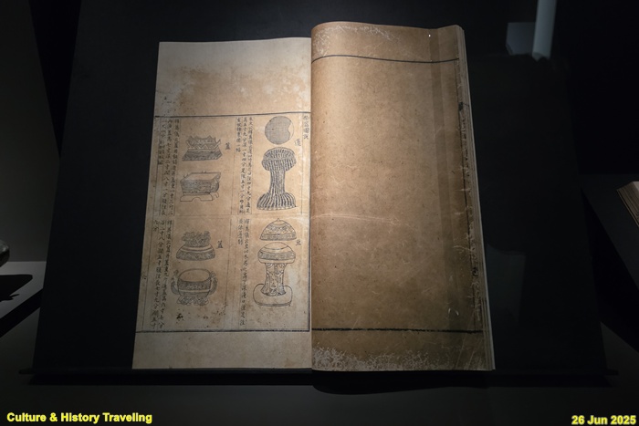 조선 초 예제 정비의 결과물로, 세종 대 여러 시도와 연구를 바탕으로 1454년(단종. 2) 『세종실록』「오례」를 정리하였습니다. 여기에 세조 대 보완을 거쳐 1474년(성종 5) 『국조오례의』로 최종 정비하였고, 여기에 각종 통계자료와 도설을 함께 수록한 것이 바로 『국조오례의서례』입니다. 세종대 실제 의례 운용에 따른 경험의 축적과 정리로 「오례」가 세워졌고, 오례에 쓰이는 기명은 도설에 그림과 설명으로 제시하였습니다. 오례 중 가장 먼저 정비가 시작되고 왕실 의례 대부분을 차지한 길례의 제기도설해에 각종 제기의 생김새와 쓰임이 기록되어 있습니다. (안내문, 중앙박물관 특별전, 2025년)