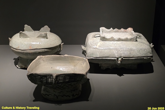 분청사기 보簠와 궤簋입니다. 사각의 보는 땅을 의미하며 음陰의 성격을 지닙니다. 보에는 벼와 찰기장을 담아 제사상 중앙에 궤와 함께 올렸습니다. 원형의 몸체를 가진 궤는 둥근 하늘과 양의 성격을 상징합니다. 제사 때 메기장과 피직皮稷을 담아 제사상 중앙에 보와 함께 진설했습니다. 보와 궤는 『세종실록』「오례」 길례 제기도설의 금속 보·궤와 매우 유사합니다. 1423년(세종 5) 부족한 금속원료를 대신하여 봉상시에서 원단의 제기를 자기로 제작한 일과, 1430년(세종 12) 봉상시의 각색 제기를 본떠 자기로 제기를 번조하도록 하는 기록에 잘 부합하는 예입니다. (안내문, 중앙박물관 특별전, 2025년)