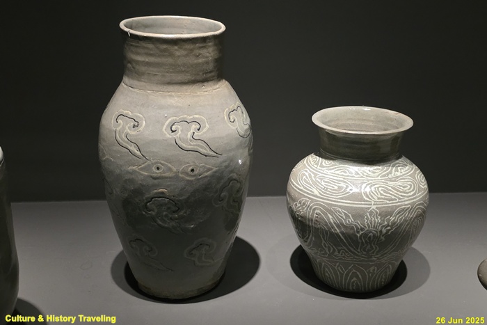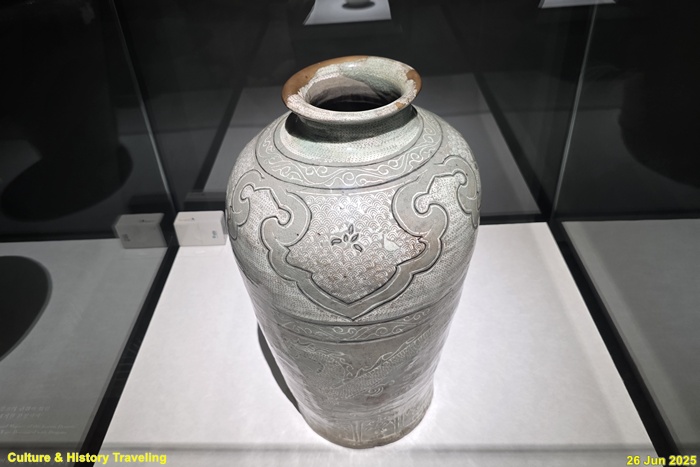 높이 50센티미터에 가까운 대형 분청사기 항아리로 몸체 하단부에 상감기법으로 두 마리의 용을 새겼습니다. 용은 구름 속에서 여의주를 희롱하며 하늘을 나는 모습입니다. 목 부분과 어깨의 커다란 여의두문 바깥면으로는 작은 국화문의 인화 도장이 빼곡히 찍혀 있어, 상감 기법을 주로 하고 인화 기법이 일부 사용되는 단계의 모습을 보여줍니다. 이 항아리는 청화백자 용준이 사용되기 이전 왕실의 용준으로 기능하였던 것으로 추정됩니다. 전통의 계승과 새로운 영향을 동시에 반영하며, 문양 표현과 유색에서 최고급 분청사기임을 알 수 있습니다. (안내문, 중앙박물관 특별전, 2025년)
